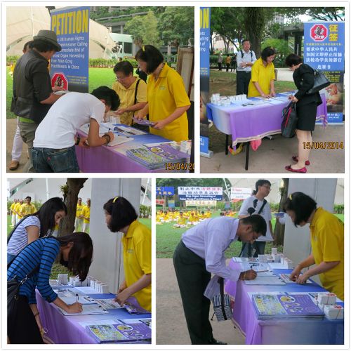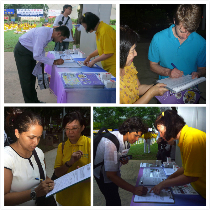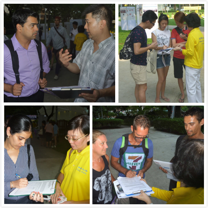 在活动现场,揭露中共活体强摘法轮功学员器官罪行的图文展示与学员们平和炼功的场面形成了鲜明的对比。来到现场的除了新加坡民众外,还有众多各国的游客、学生或工作人士,他们来自印度、奥地利、英国、美国、中国、塞尔维亚、俄罗斯、塞浦路斯、菲律宾、斯里兰卡、缅甸、墨西哥、巴基斯坦,以及波兰等国。人们了解真相后,有上百人在呼吁制止中共迫害法轮功的联署书上签名。