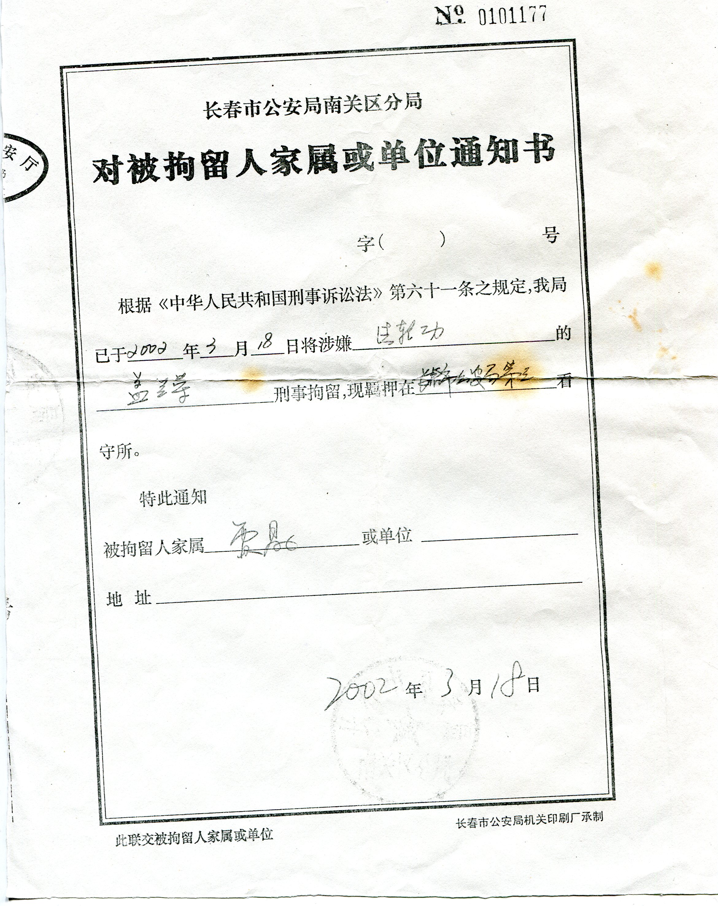 二零零零年十一月二十五日长春市公安局南关区分局至善派出所樊东超,到我家说让我到派出所去一趟,说是要了解一些情况,核实一些事。当时没多想,我就跟他到了至善派出所,到了那里他们直接把我送到长春市大广拘留所拘留十五天,借口是:“妨碍社会管理秩序”。