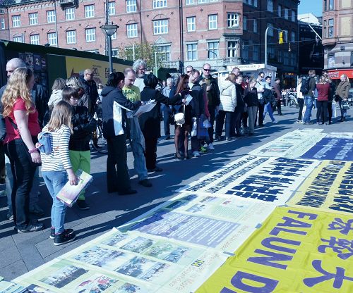 丹麦哥本哈根市政厅广场,游客签名谴责中共迫害法轮功