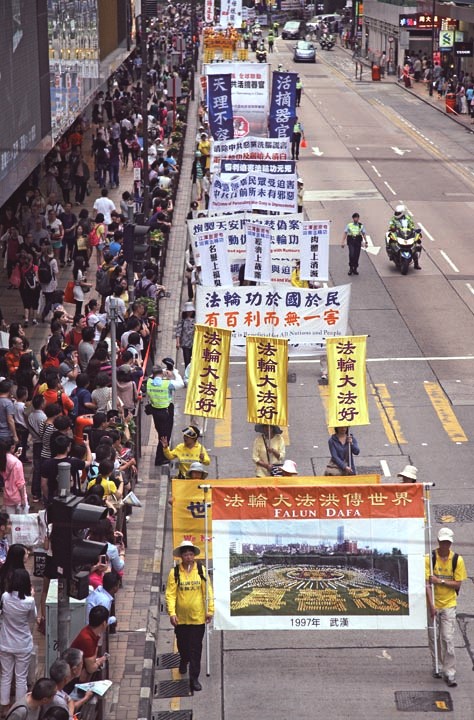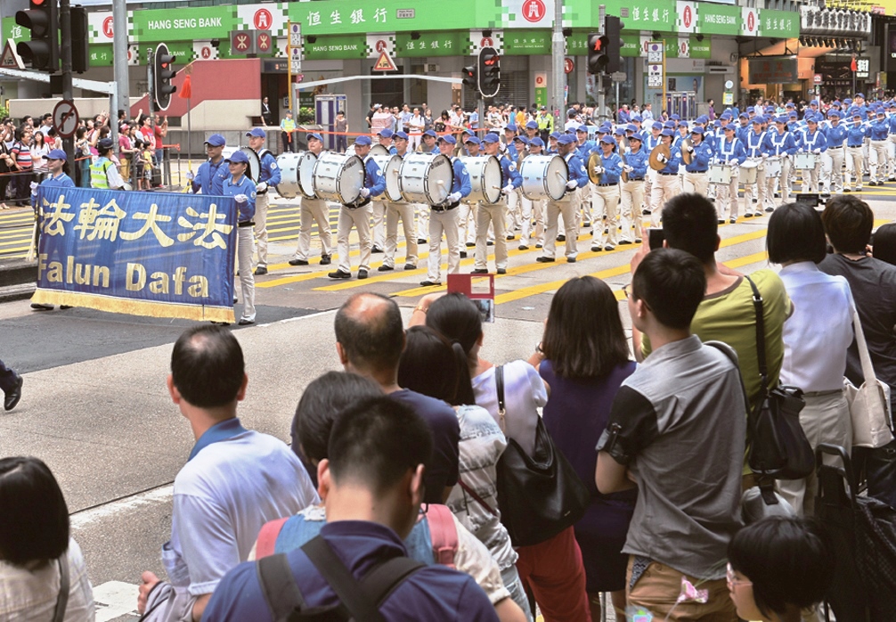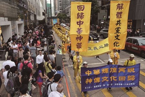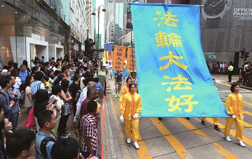 壮观的遊行队伍吸引了不少大陆遊客驻足观看,纷纷用手机、相机拍摄画面。大陆遊客在香港旅行购物之余,看到在大陆看不到的画面,不少人说,感到非常震撼,他们对于警察紧随遊行队伍旁边规划,为遊行路线开道感到惊讶。不少人因此了解法轮功真相,当场请沿路派发资料、讲真相的学员义工协助办了三退(退出共产党、团、队)。