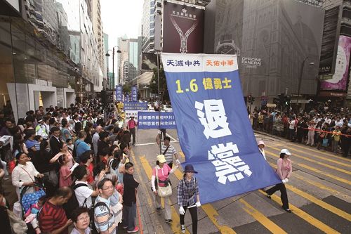图13-14. 遊行队伍的横幅真相触动人心,许多大陆遊客把握机会办理三退(退出中共党、团、队等组织)。