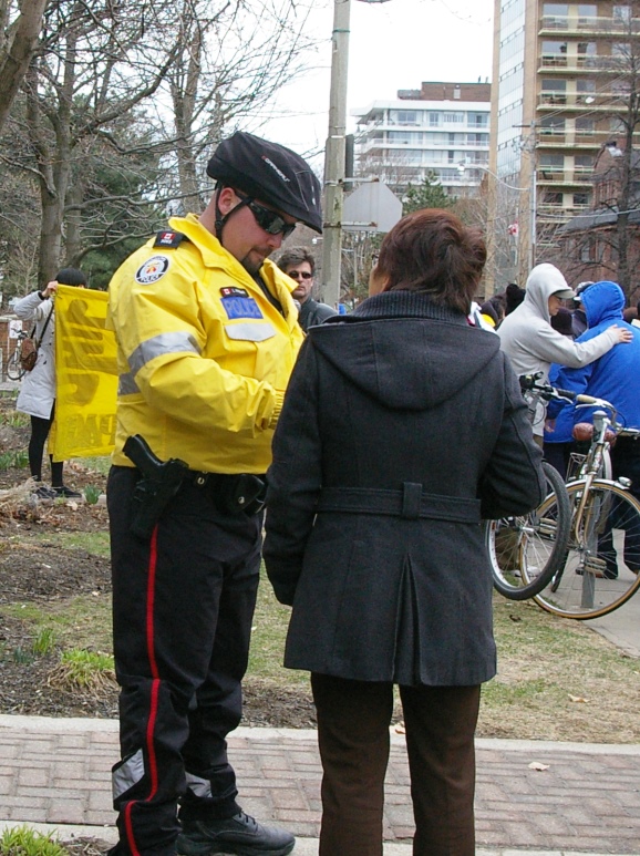 当天在集会现场值班的是多伦多警察分局的五十六分队的警员,他们对法轮功学员如此平和的抗议方式表示赞赏,他们值班的车上写着:服务和保护人民(Serving and protecting the people)。法轮功学员给他们讲了四•二五事件在中国发生的经过,讲到了七二零中共发动迫害,讲了中共对法轮功学员十五的残酷迫害,活体摘取法轮功学员器官牟利,他们听后都很震惊。警员Whitefield说:“你们应该把这真相让更多的人知道,让我所有的同事都知道,你们可以到警察局去给所有的警员讲。”