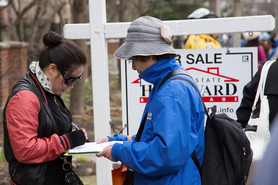 下午四点至六点,虽然天下着雨,学员们还是在中领馆附近的大学街(University)和布鲁街(Bloor)路口拉起横幅,筑起真相长城给路人讲真相,并举行“制止中共活体摘取法轮功学员器官”的征签活动。