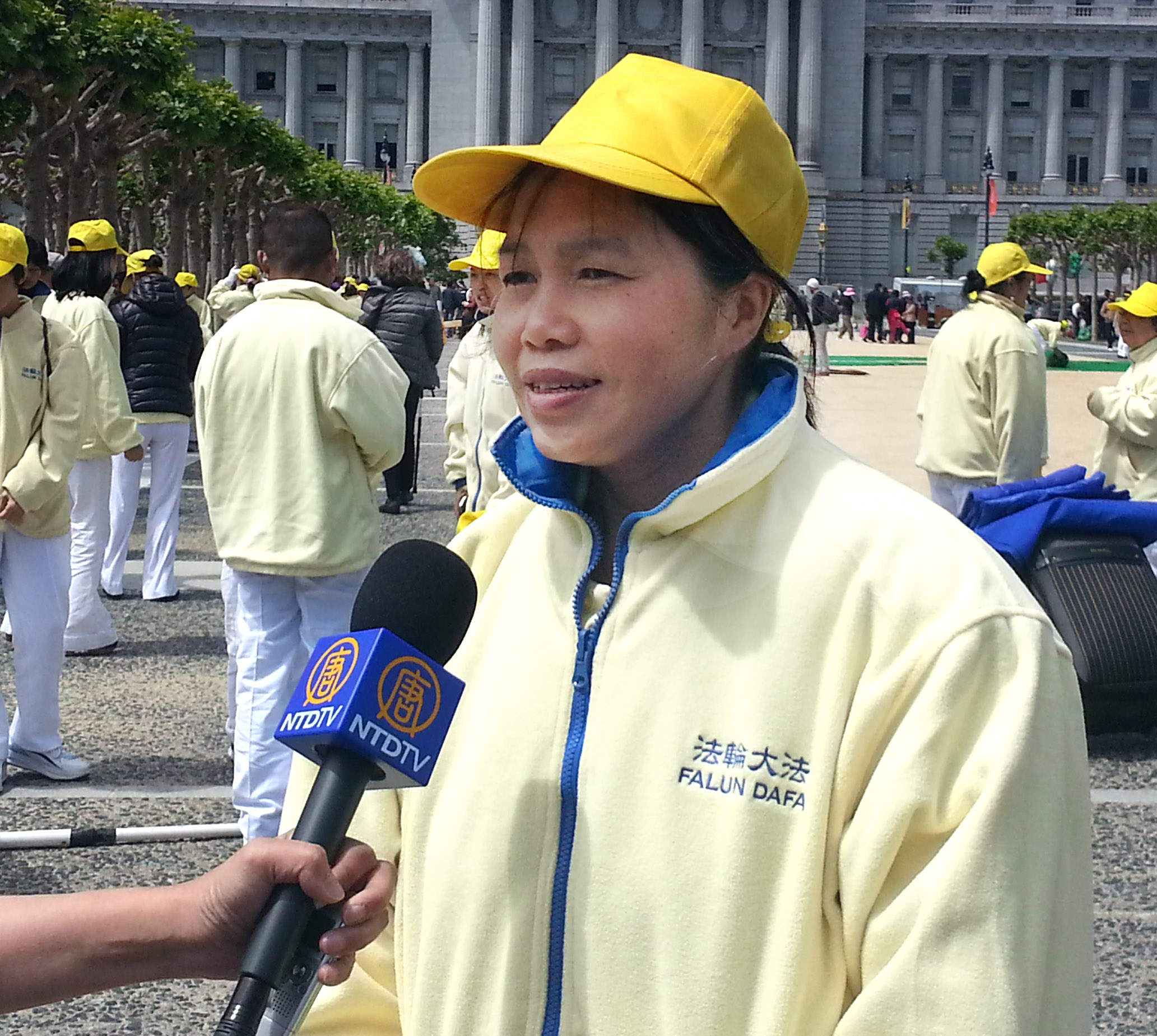 黄云说:“今天我们在旧金山举办了一系列活动。上午的活动是在旧金山市政府前广场排字。法轮功学员通过排‘法轮大法好’、‘真、善、忍’、‘正法’等,用这种方式告诉社会:法轮功是正法。法轮大法是教人向善的高德大法。我们今天排的字是‘正法’两个字。告诉人们:法轮大法是正法。今天的排字活动是美国加州西部地区的第一次。学员们配合的非常好,正念场非常强,我们的活动很成功。”