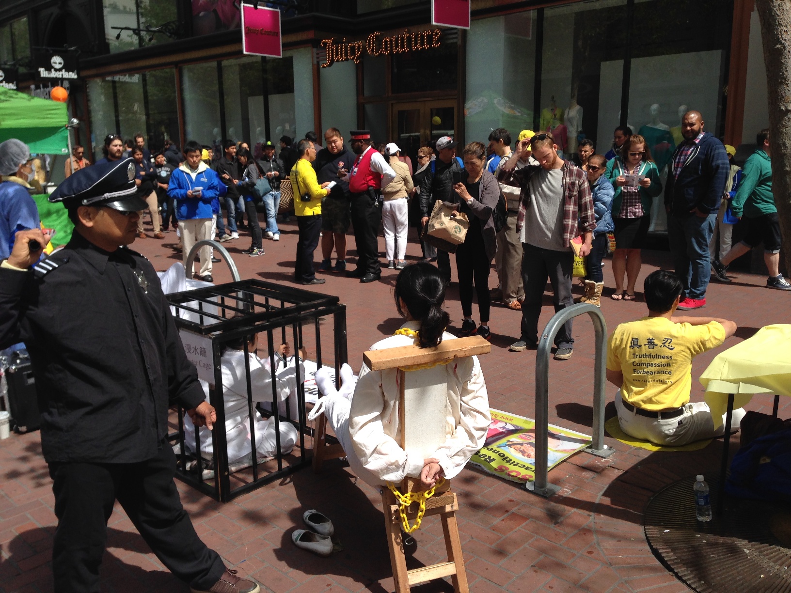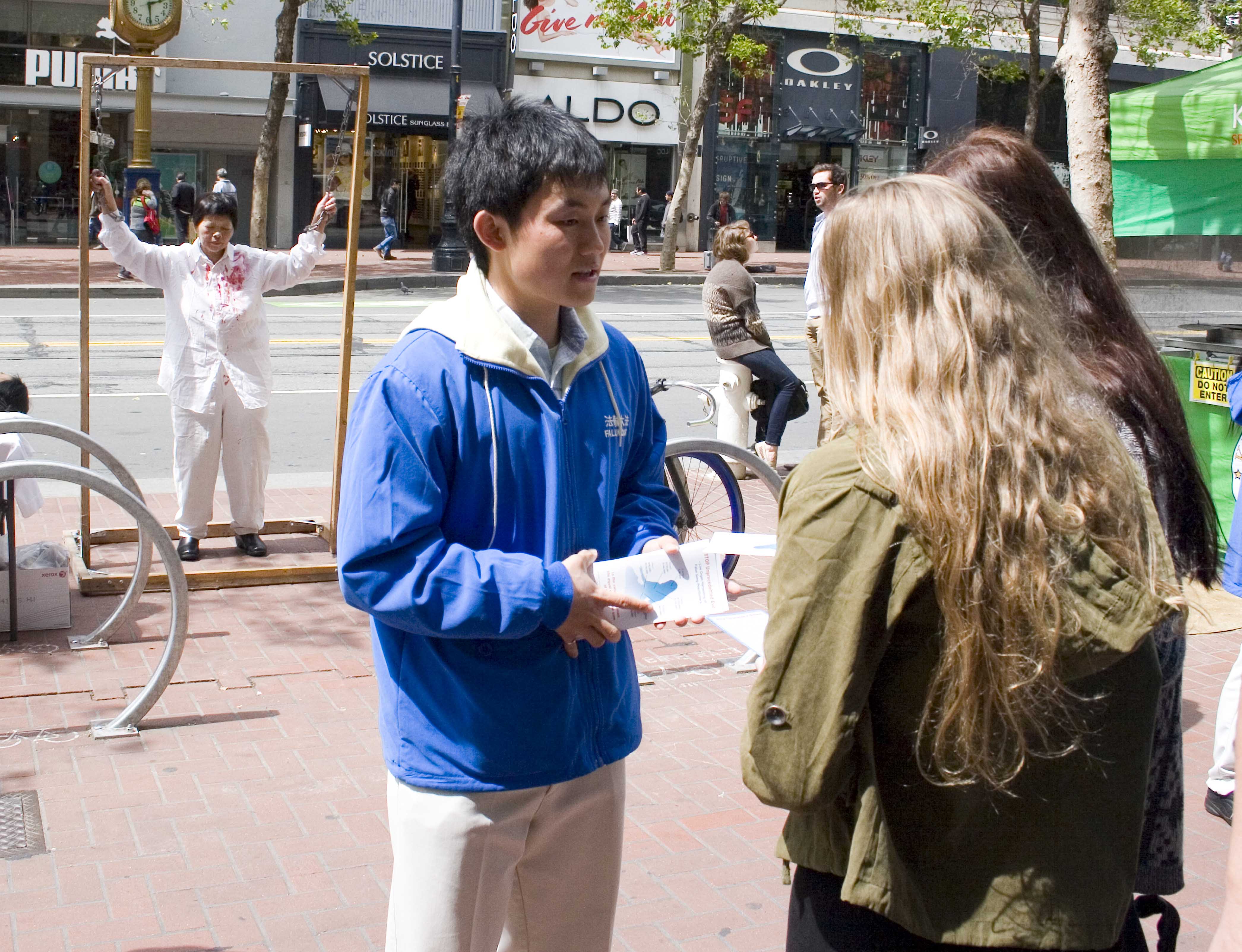 星期六,在旧金山繁忙的市场街高级购物中心外,法轮功学员举办了反酷刑展,引起众多路人驻足关注。