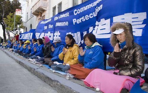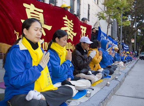 法轮功学员高举着“真、善、忍”、“四•二五和平上访铸就人类道德丰碑”、“解体中共 制止迫害”等中英文横幅,散发着慈悲、祥和的热量。他们并点燃蜡烛,表达着他们对被迫害致死的同修们的缅怀之情。