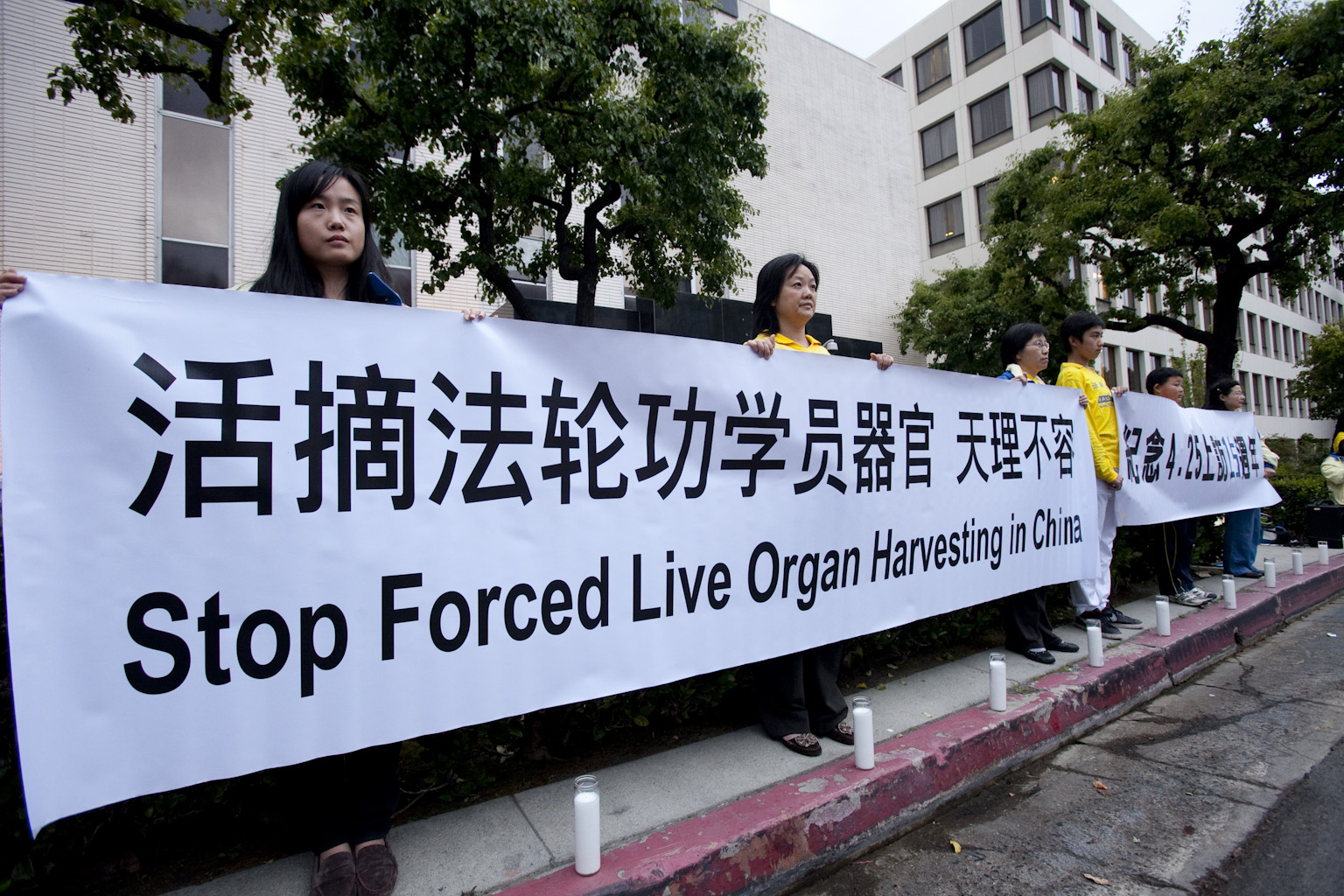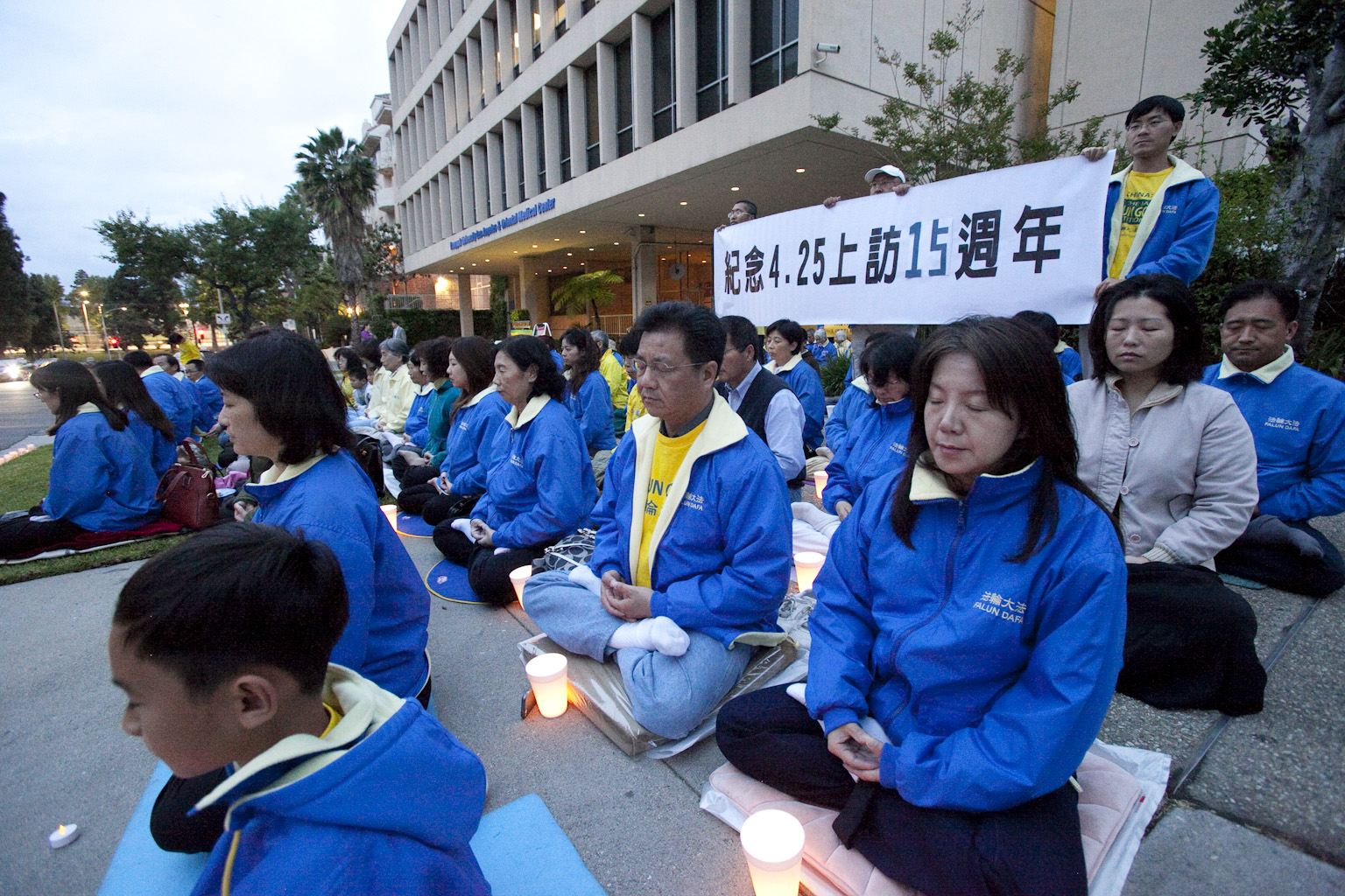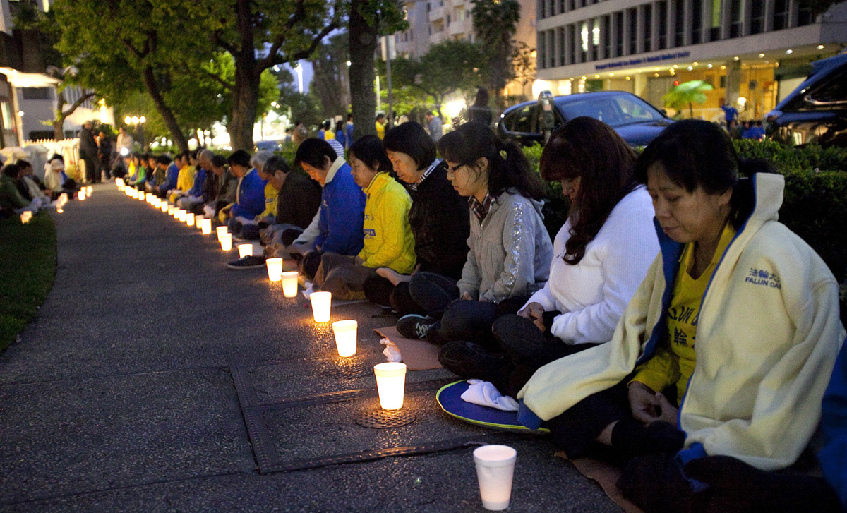 ![]() 图:星期五(4月25日),在4.25和平上访十五周年之际,2百多名法轮功学员和支持者在洛杉矶中领馆前举办烛光纪念活动。 |
