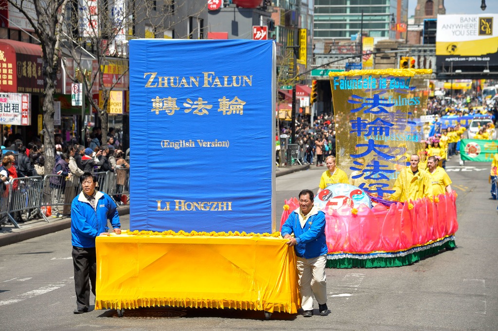 游行的第一方阵是“大法洪传”,天国乐团一曲震撼人心的“法轮大法好”,引领了当日的游行。五彩缤纷的旗队气势亮丽。中英文大型《转法轮》书模型缓缓前行,佛法的慈悲普照着万物。五彩横幅向世人讲述着大法的美好。手提镶有“法轮功”、“真善忍”字样灯笼和摇着旱船身着美丽服饰的法轮功学员向世人传达着法轮大法的美好。