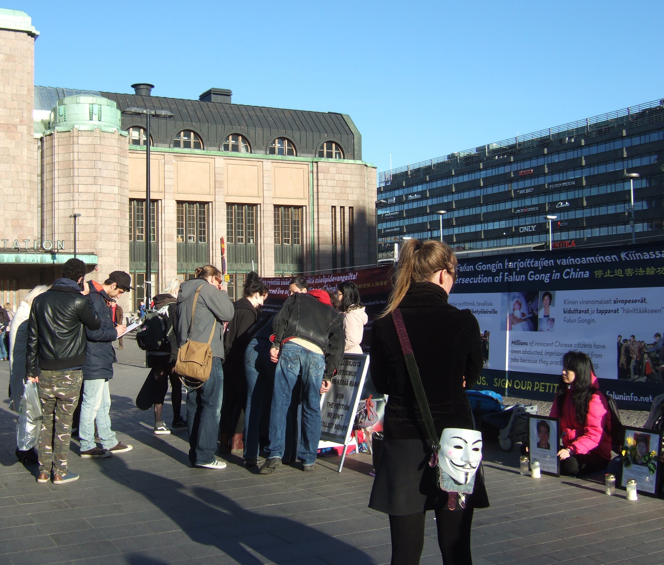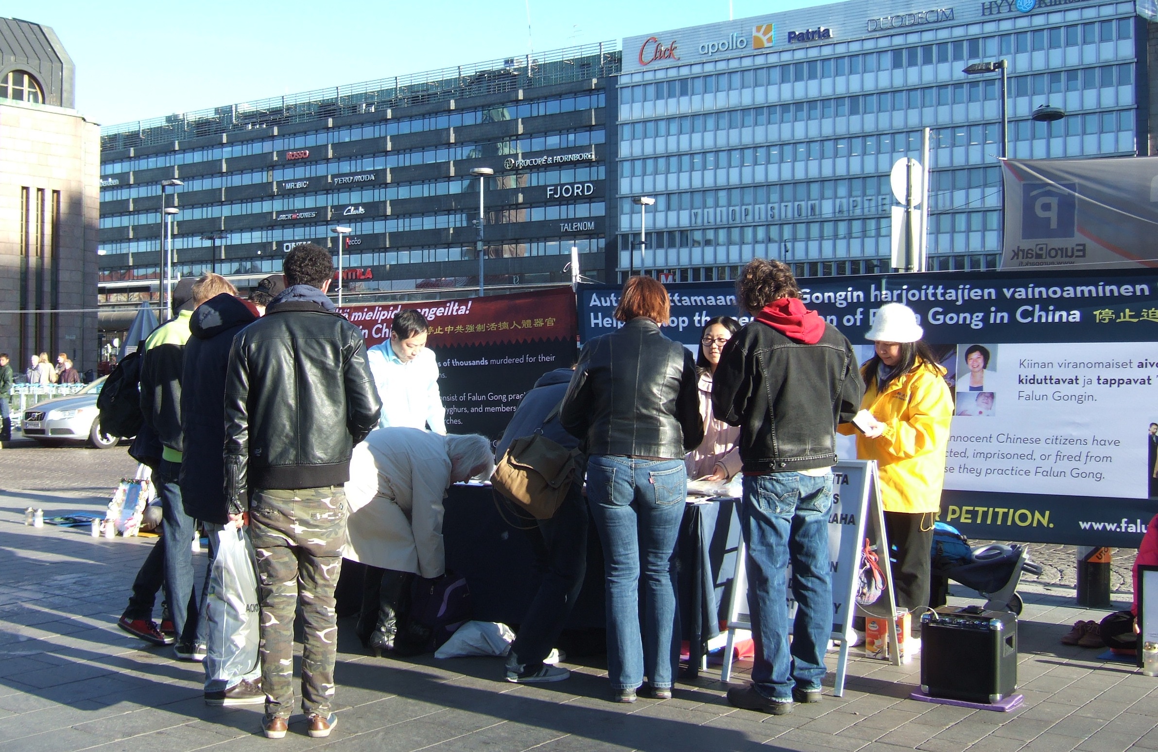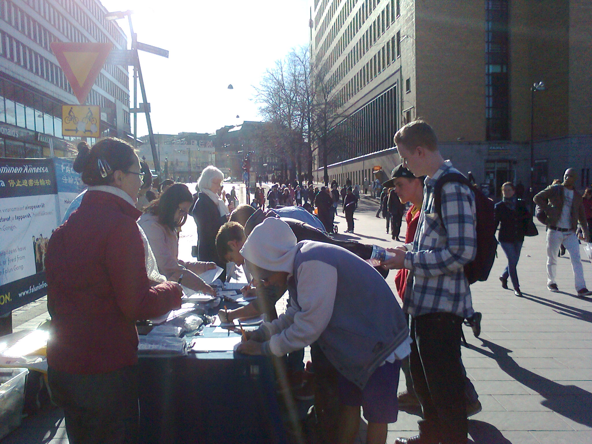 法轮功学员下午在首都赫尔辛基火车站旁举行神圣的烛光守夜,悼念三千多名被中共迫害致死的法轮功学员。期间一批批民众了解法轮功被迫害真相后,踊跃签名反迫害场面感人,有七位学生签名支持反迫害活动后深深地向学员鞠躬,感谢学员为世人做一件维护社会道德的正义之事。