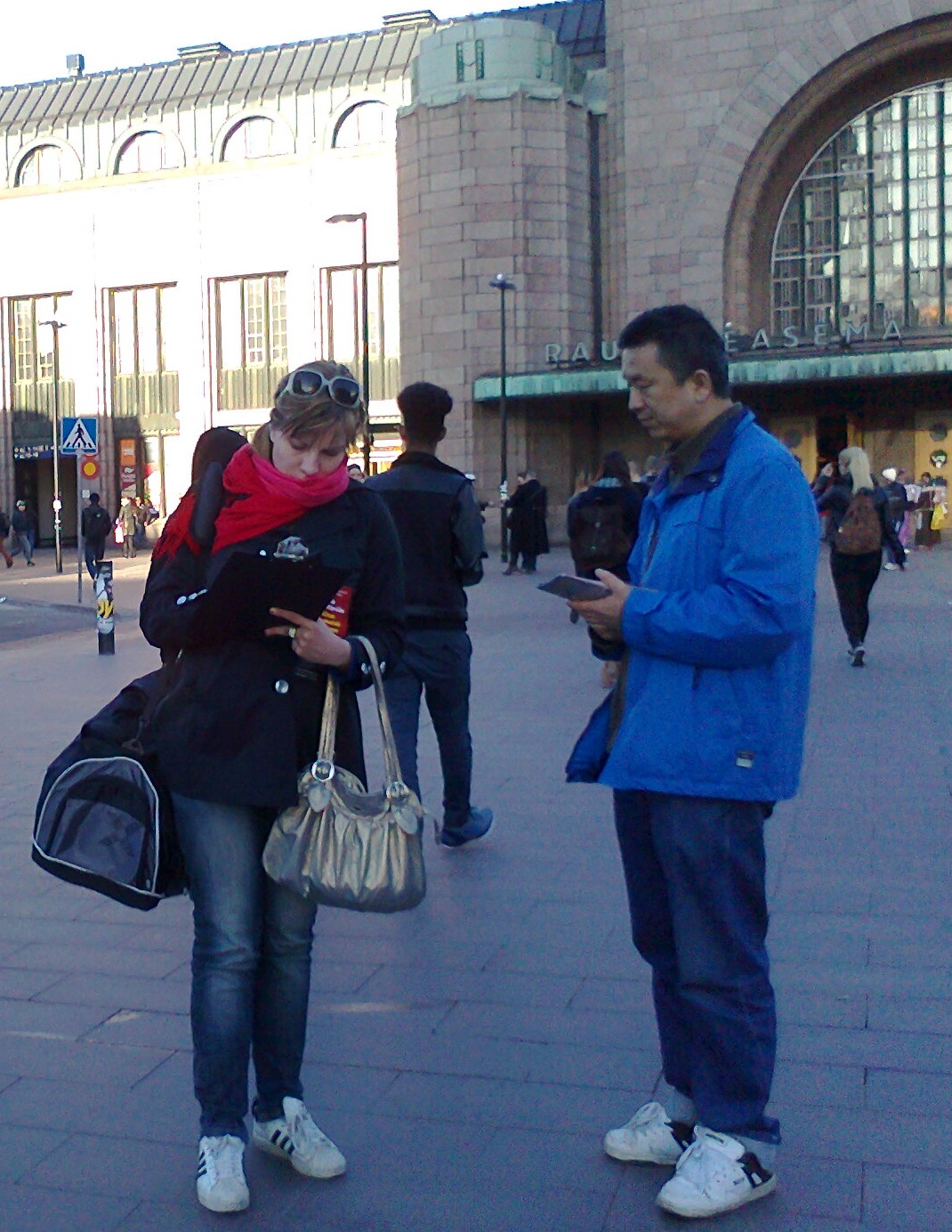 活动现场,一方面学员们手持被中共非法迫害致死的学员遗像默默地悼念;另一方面学员用芬兰语和中文不断讲述中共十五年前的今天,上万名的法轮功学员本着真,善,忍的理念,中国宪法赋予公民的权利,来到北京信访办门前和平理性的上访。
