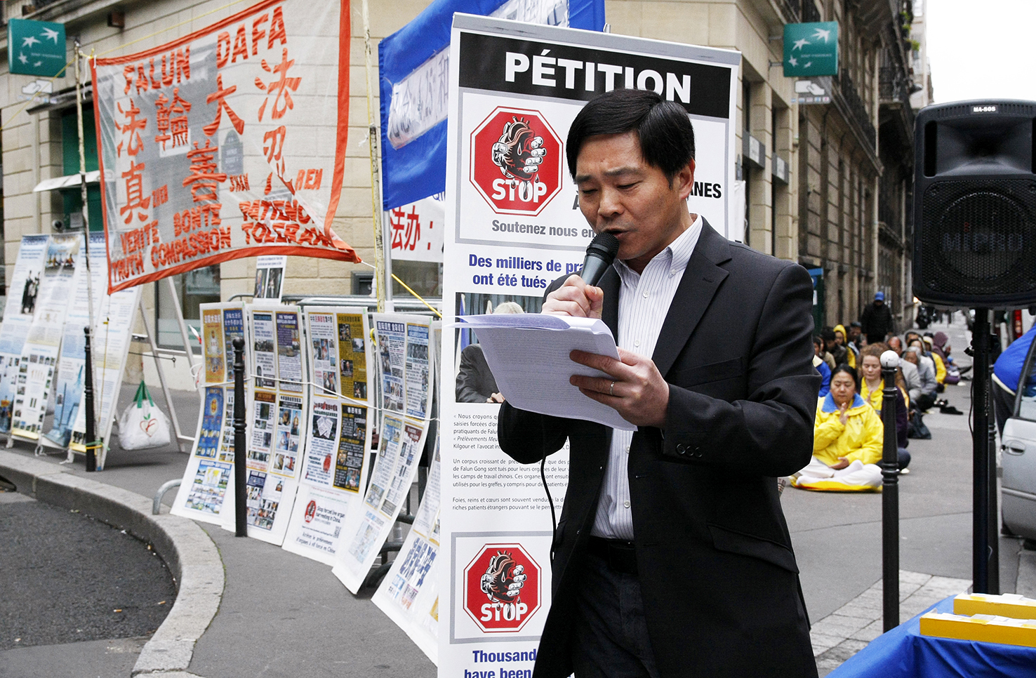 法国法轮大法协会主席唐汉龙先生在集会上发言说:“十五年前的四月二十五日,上万名中国法轮功学员去北京和平上访,希望政府给予中国老百姓自由修炼法轮功的基本权利,事隔不到三个月,七月二十日中共则发动了对全中国法轮功学员的残酷迫害:酷刑折磨、洗脑、非法抓捕、劳教和判刑,甚至活摘法轮功学员的器官,十五年来迫害一直存在着。”他呼吁立即停止迫害,法办迫害元凶——江泽民、曾庆红、罗干、周永康等。与此同时,与会的法轮功学员则通过静坐和炼功的和平方式抗议中共的迫害。