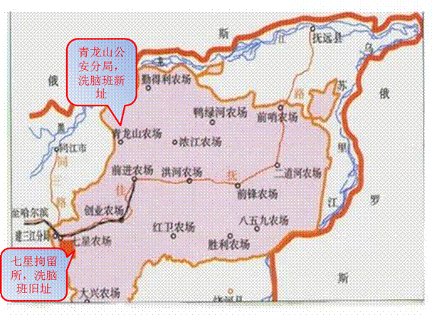 黑龙江省农垦总局在二零零零年开始在建三江设立黑龙江省农垦总局法制教育基地,其中二零零零年到二零零九年建在七星农场拘留所内,二零一零年至今建在青龙山农场公安分局旁,也就是今天所共知的青龙山洗脑班。为了行文方便,我们使用“农垦总局法制教育基地”作为从二零零零年以来设在建三江的“黑龙江省农垦总局法制教育基地”的统一称谓。