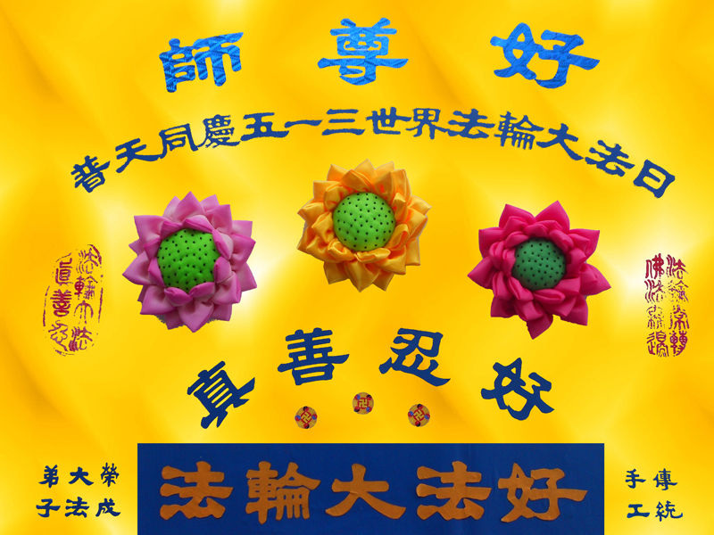 【明慧网二零一四年五月十一日】莲出淤泥而不染。山东省荣成市大法弟子为恭贺师尊华诞、庆祝五一三世界法轮大法日、庆祝法轮大法洪传二十二周年而创作的布贴画。