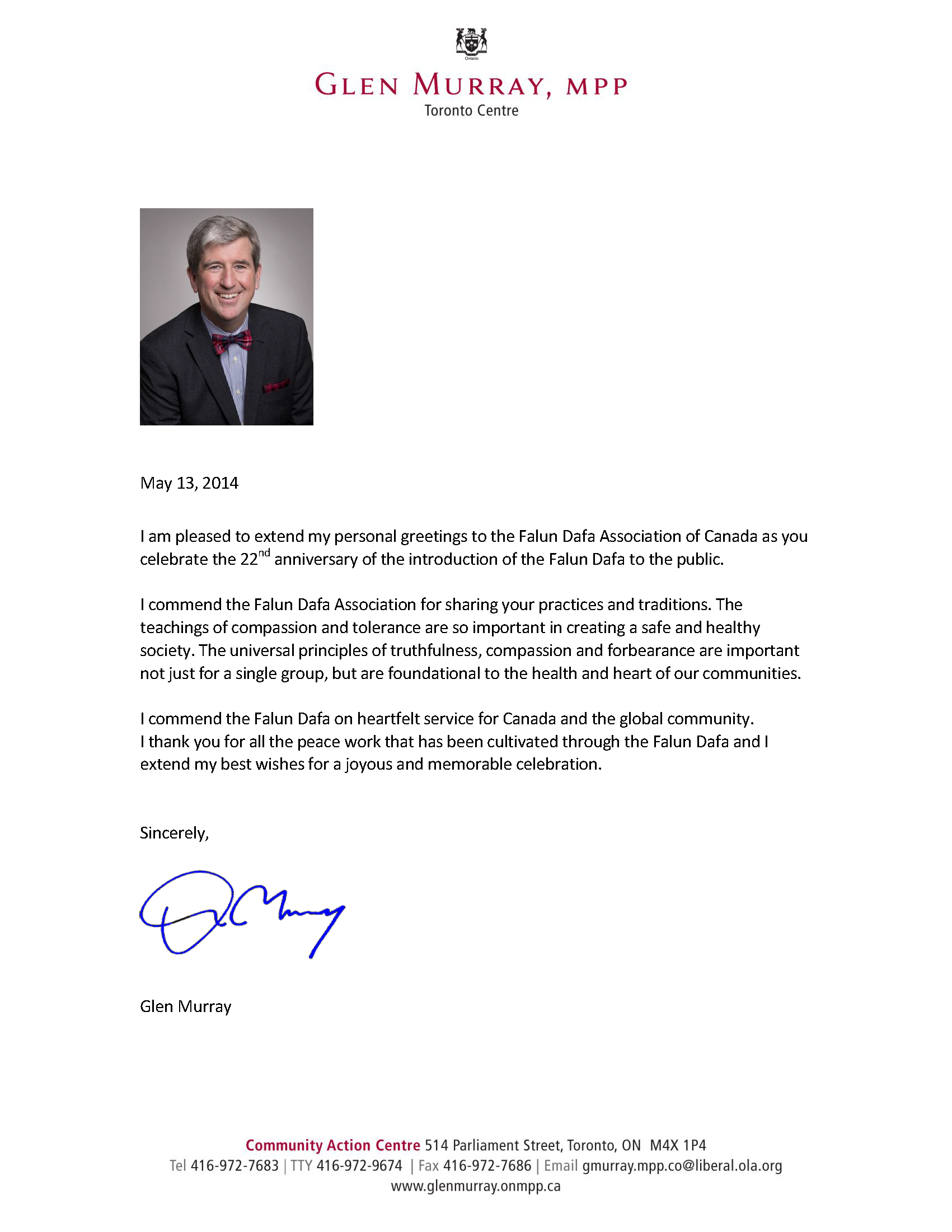安河交通及基础建设厅长莫雷(Glen Murray)在贺信中称,加拿大法轮大法学会庆祝法轮大法传世二十二周年之际,很高兴能呈上真挚的祝贺。