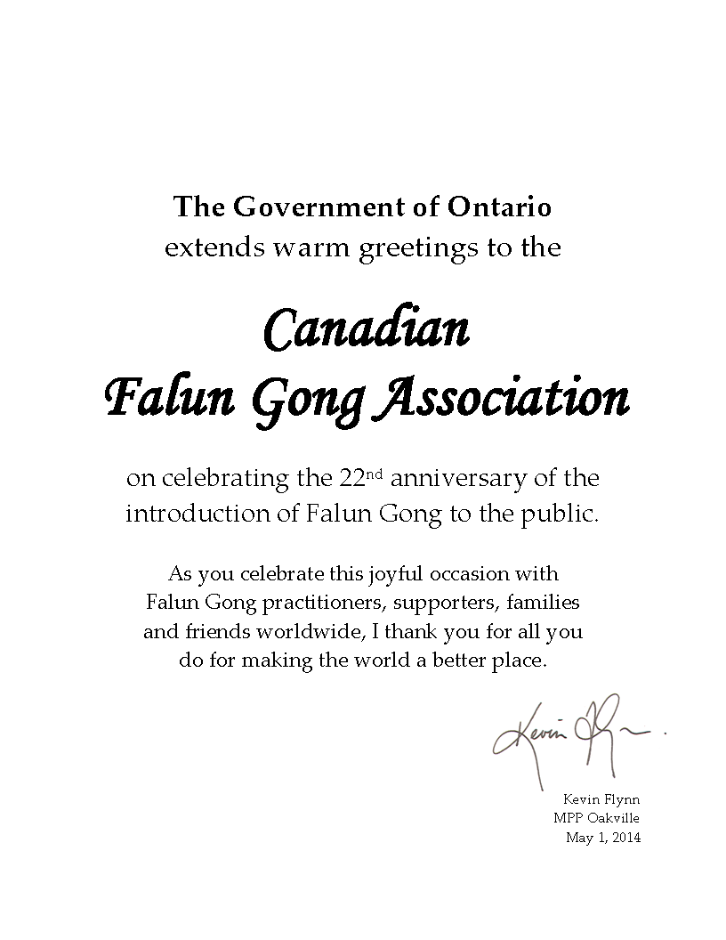 安河劳工厅厅长弗林(Kevin Flynn)在贺信中称,值此法轮大法洪传二十二周年之际,他代表安省政府向加拿大法轮大法学会表示热切的祝贺。
