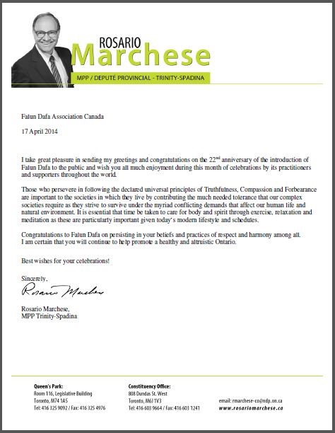安河新民主党省议员马切斯(Rosario Marchese)在贺信中说,他很荣幸向法轮大法传世二十二周年庆典献上诚挚的祝贺,“我祝愿世界各地的法轮大法修炼者和支持者们度过一个美好的庆典之月。”