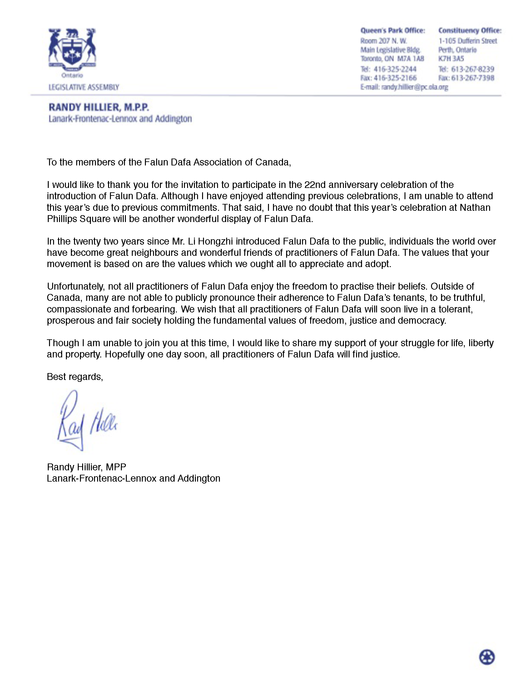 安河保守党省议员希利尔(Randy Hillier)在贺信中称,他以前参加过庆祝法轮大法洪传于世的活动,感到非常荣幸。这次很遗憾不能亲自参加。“毫无疑问,今年在市政厅广场举办的庆典活动,将是法轮大法又一次的精彩展示。”