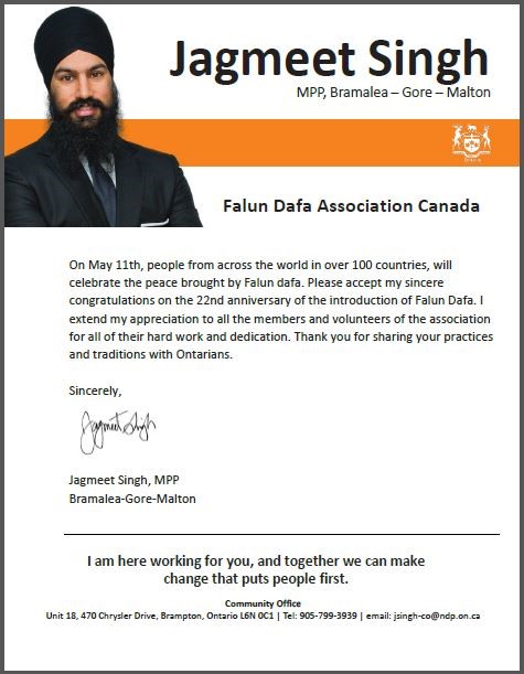 安河新民主党省议员辛格(Jagmeet Singh)在贺信说,5月份将有100多个国家的人共同庆祝法轮大法所带来的和平与祥和。“请接受我对法轮大法传世22周年庆典的诚挚祝贺。我要感谢大法佛学会中所有学员及义工的辛勤工作和付出。非常感谢你们向安河人分享你们的功法和理念。”