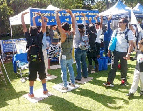 ![]() 第二十五届美国加州圣地亚哥地球日街市上,络绎不绝的民众来到法轮功展位前学功 |
