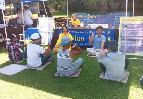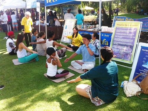 街市上的二百五十多个展位,包括绿色城市、自然生态、环境保护、健康食品、回归自然,人权,教育,宗教,音乐、文化艺术,政府政策等方方面面,吸引了六、七万游人。很多人都驻足在法轮功展位前,了解详情。
