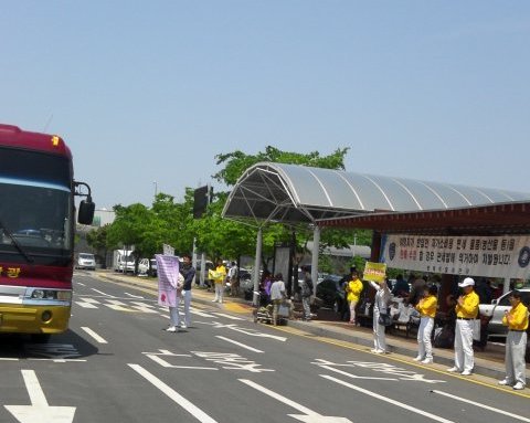 中国旅游团来韩国观光,乘坐大巴到各个景点游玩。法轮功学员把手工制作的精美莲花分别送给各个司机,好多司机高兴地把漂亮的莲花挂在大巴车上,每辆车都挂上了写有“法轮大法好”的莲花,有的挂一朵,有的挂四朵。也有好多中国游客把写有“法轮大法好“的莲花捧在手里,高兴的不得了。