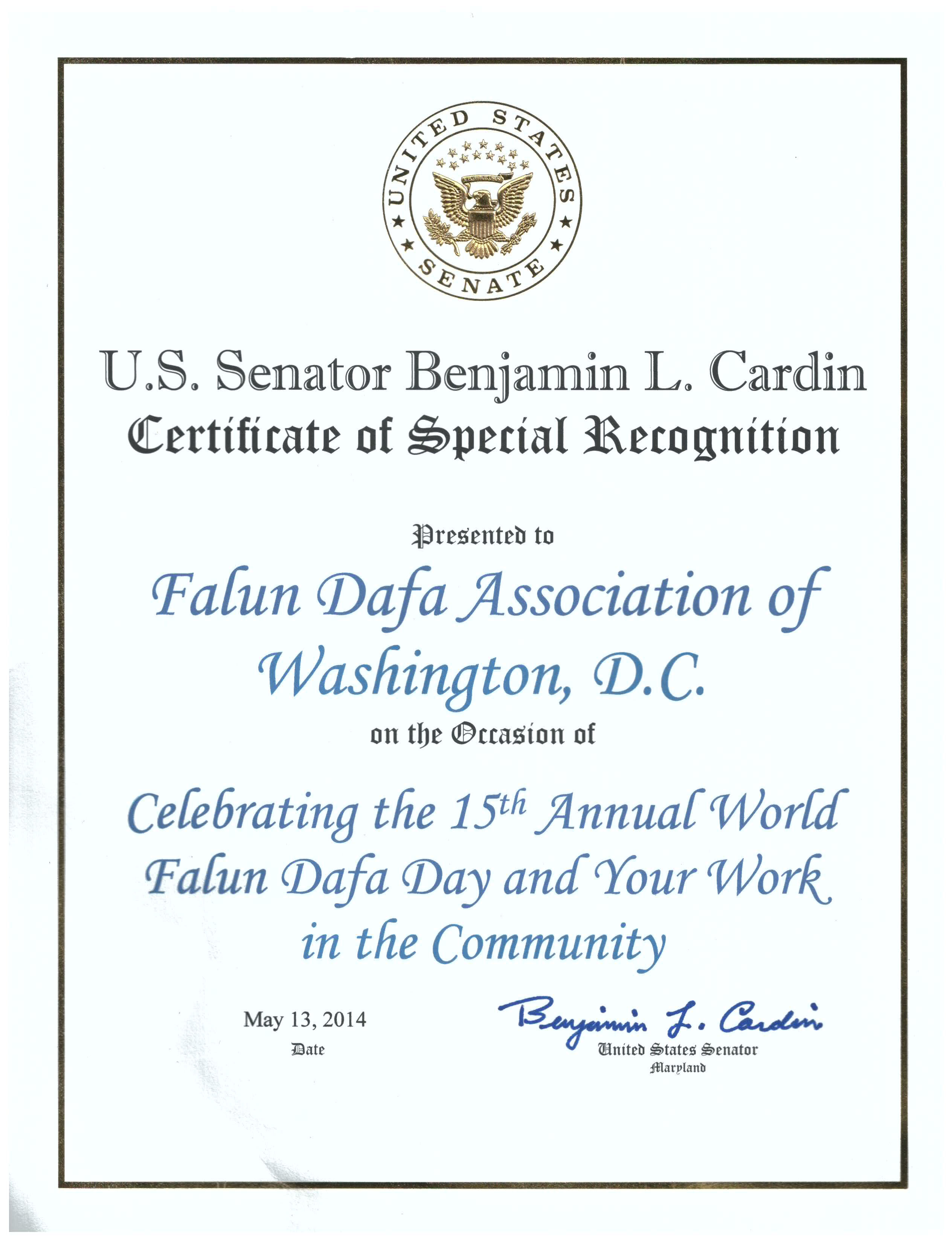 ![]() 美国联邦参议员本•卡丁向华盛顿DC法轮大法学会颁发特别奖励证书 |