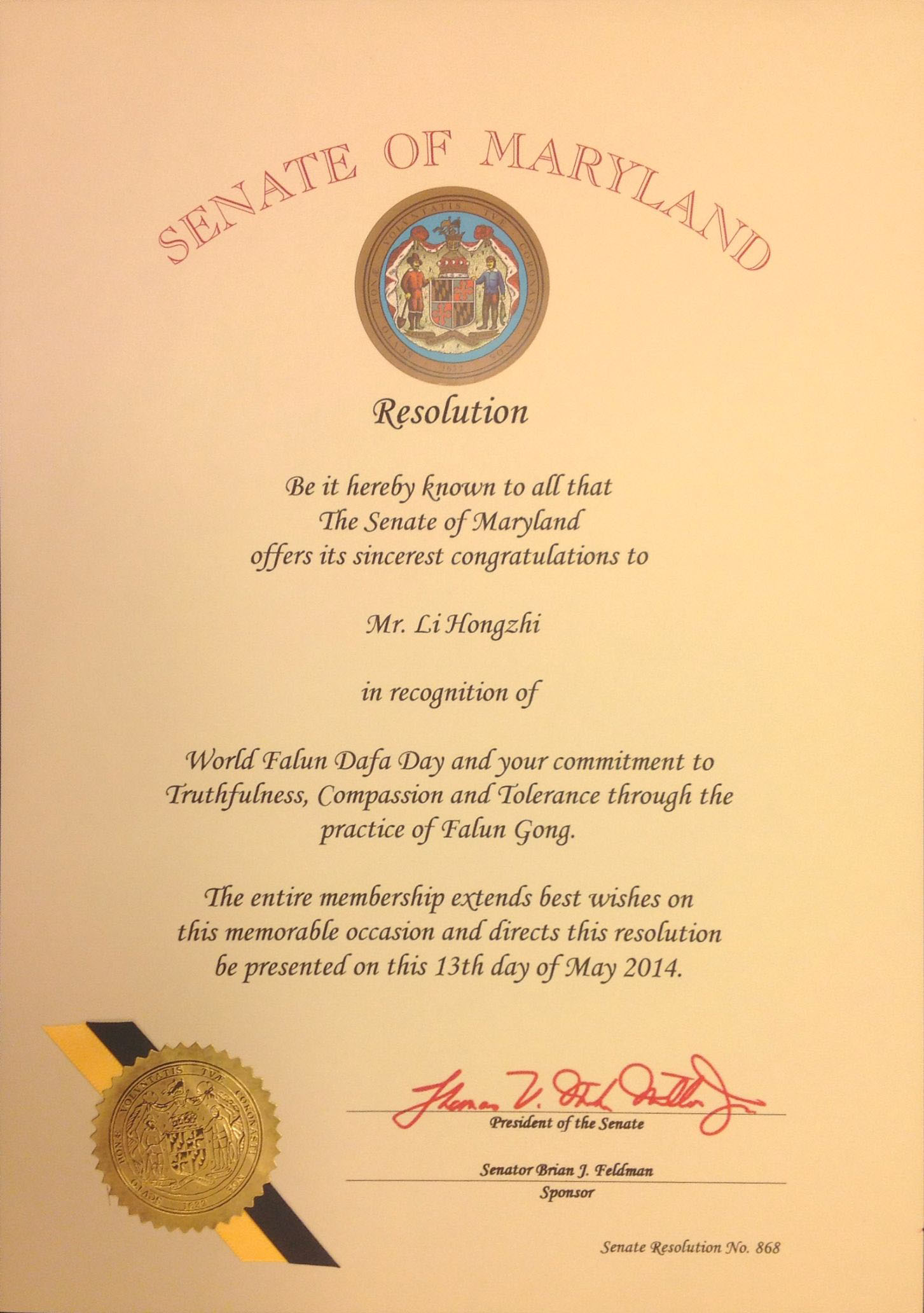 马里兰州参议院向李洪志先生致以最诚挚的祝贺,表彰世界法轮大法日以及通过修炼法轮功,你们对真、善、忍的信仰。
