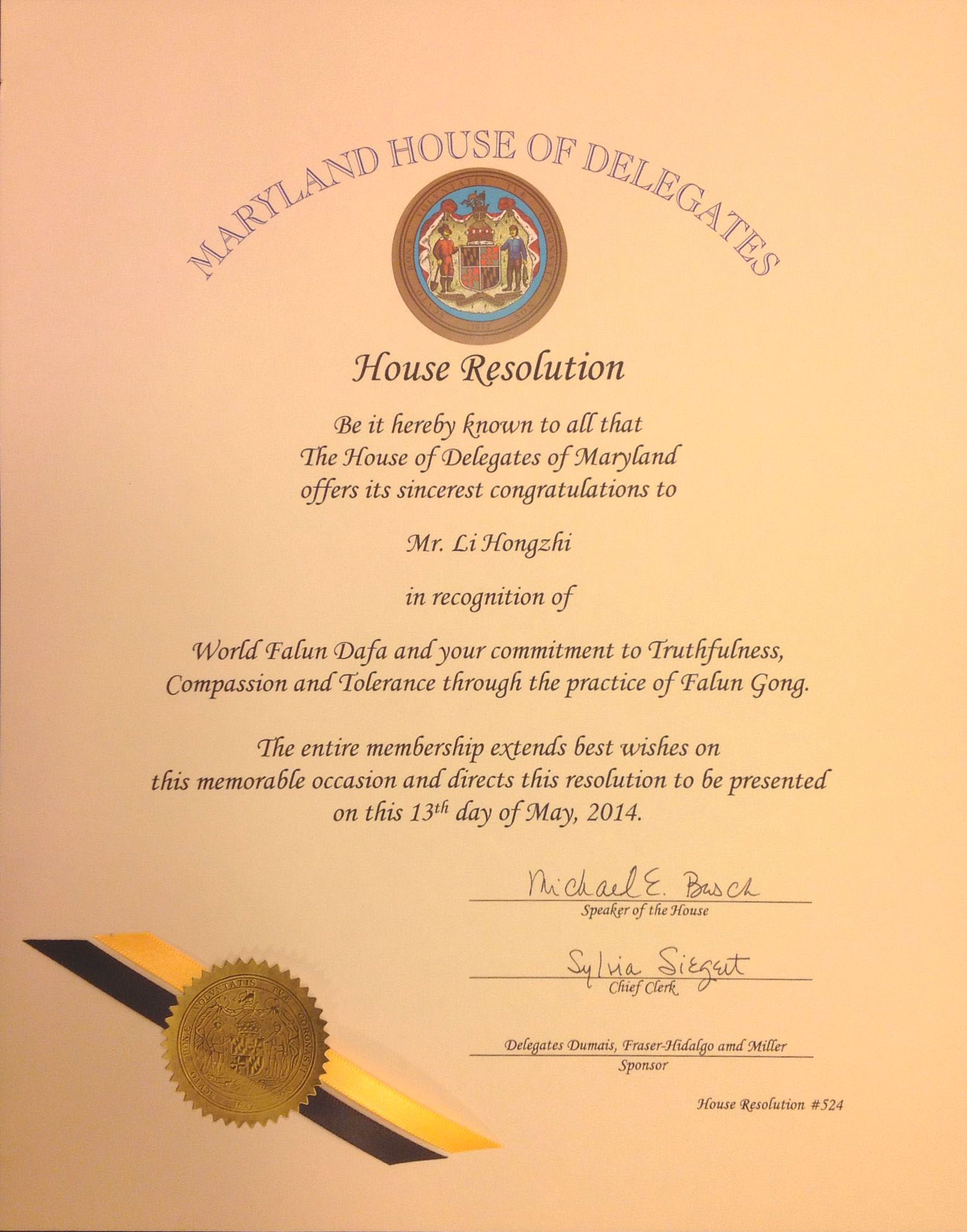 马里兰州众议院向李洪志先生致以最诚挚的祝贺,表彰世界法轮大法日以及通过修炼法轮功,你们对真、善、忍的信仰。