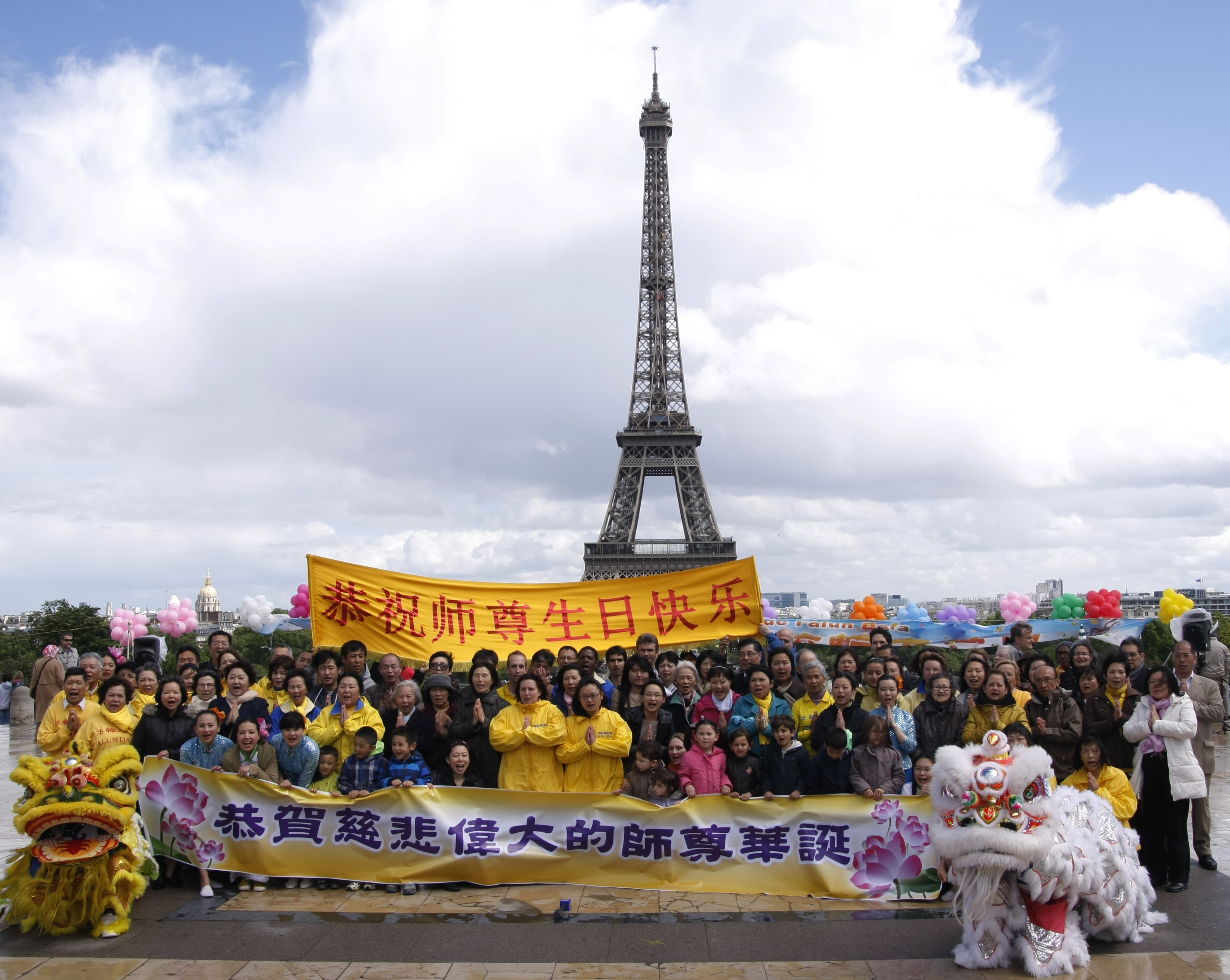 ![]() 图1:法国法轮功学员恭祝师尊生日快乐,谢师恩。 |