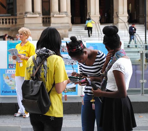 来澳旅游的三名加拿大蒙特利尔青年奥黛丽(Audrey)、杰夫(Jeff)和尼克拉斯(Nicolas)在得知法轮功学员在中国所遭受的迫害后非常震惊,他们你一句我一句地说:“太可怕了!他们没有做错任何事,(中共)迫害的很没道理。”“他们只因自己想做的事、想过的生活而被迫害,静坐有什么错?”“‘真善忍’很有道理,我们不能反对他。”“这三个原则(真善忍)会使社会更加美好,因为‘真’使人相互信任,‘善’让人懂得互助,而‘忍’则会使人无条件地帮助他人,所以这些正是良好社会中人们所需的。”