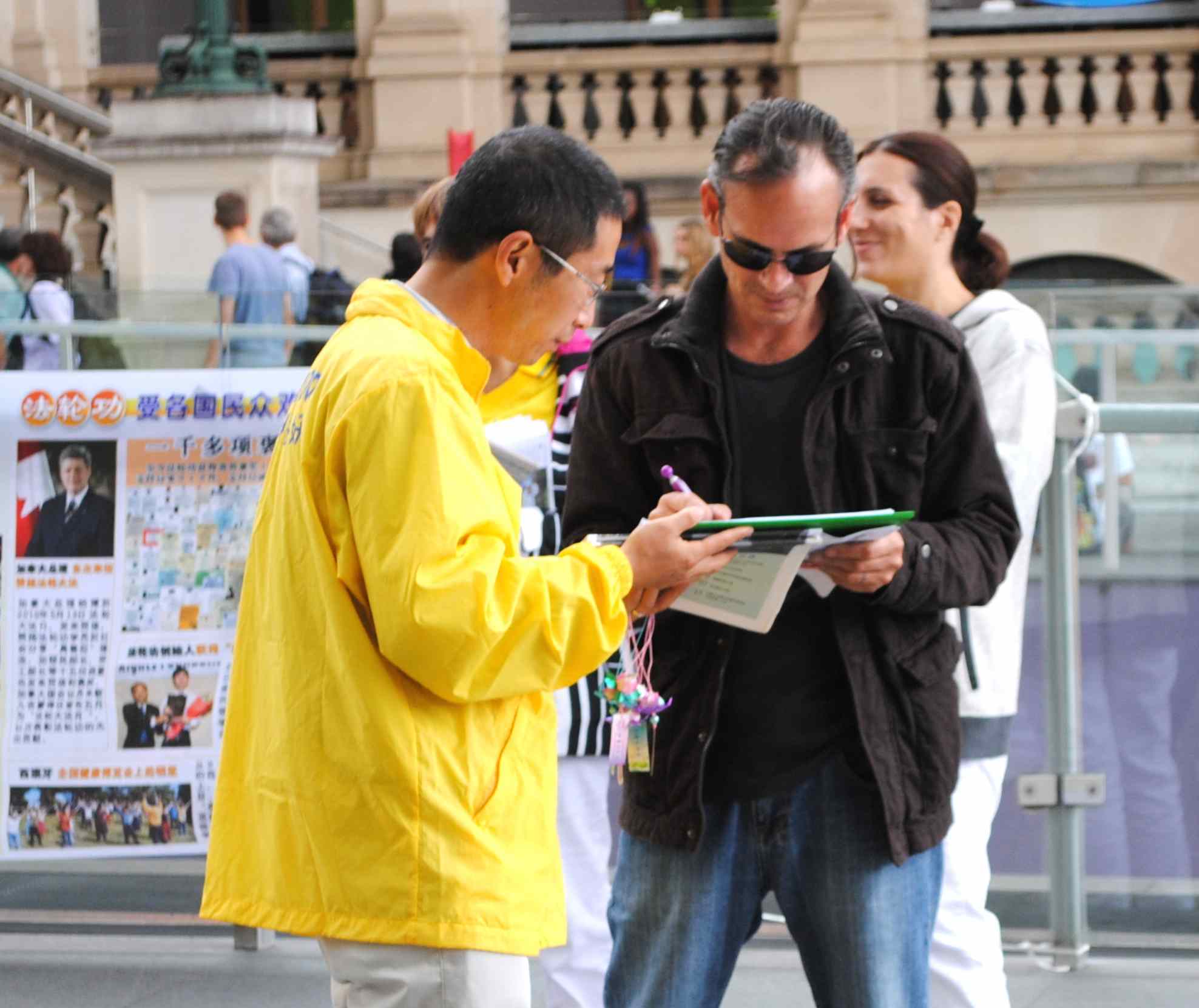 活动中,熙来攘往的行人络绎不绝,很多人前来了解法轮功并签名反对中共的迫害。