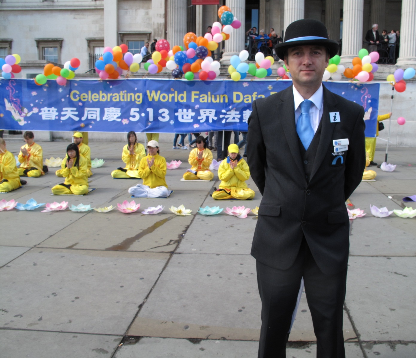 拉法尔很高兴地在世界法轮大法日庆典活动场地留影,表示要把这个照片放到伦敦街道大使(The Welcome People)的公司网站上,让对伦敦感兴趣的人都看到法轮大法的信息。