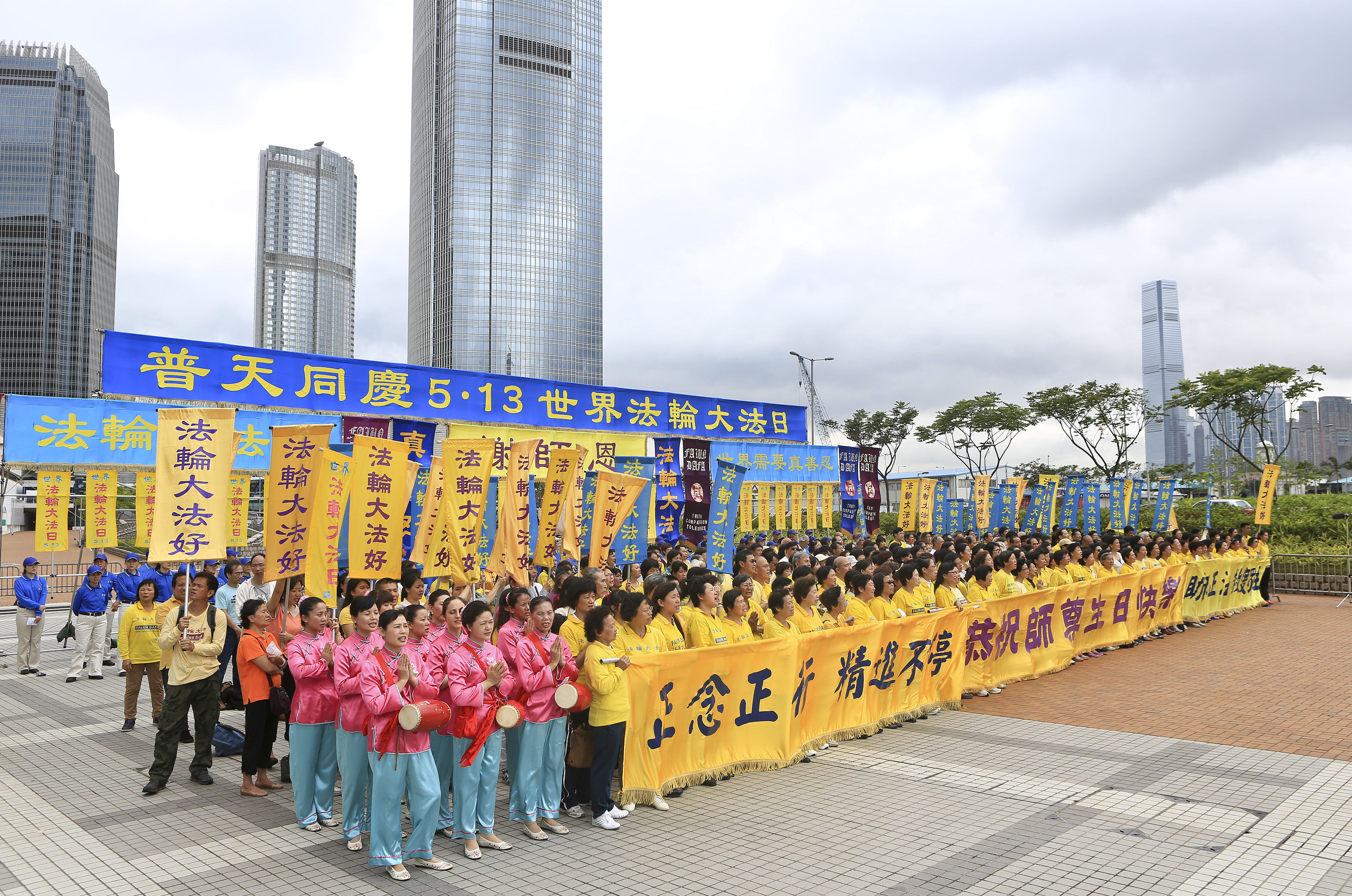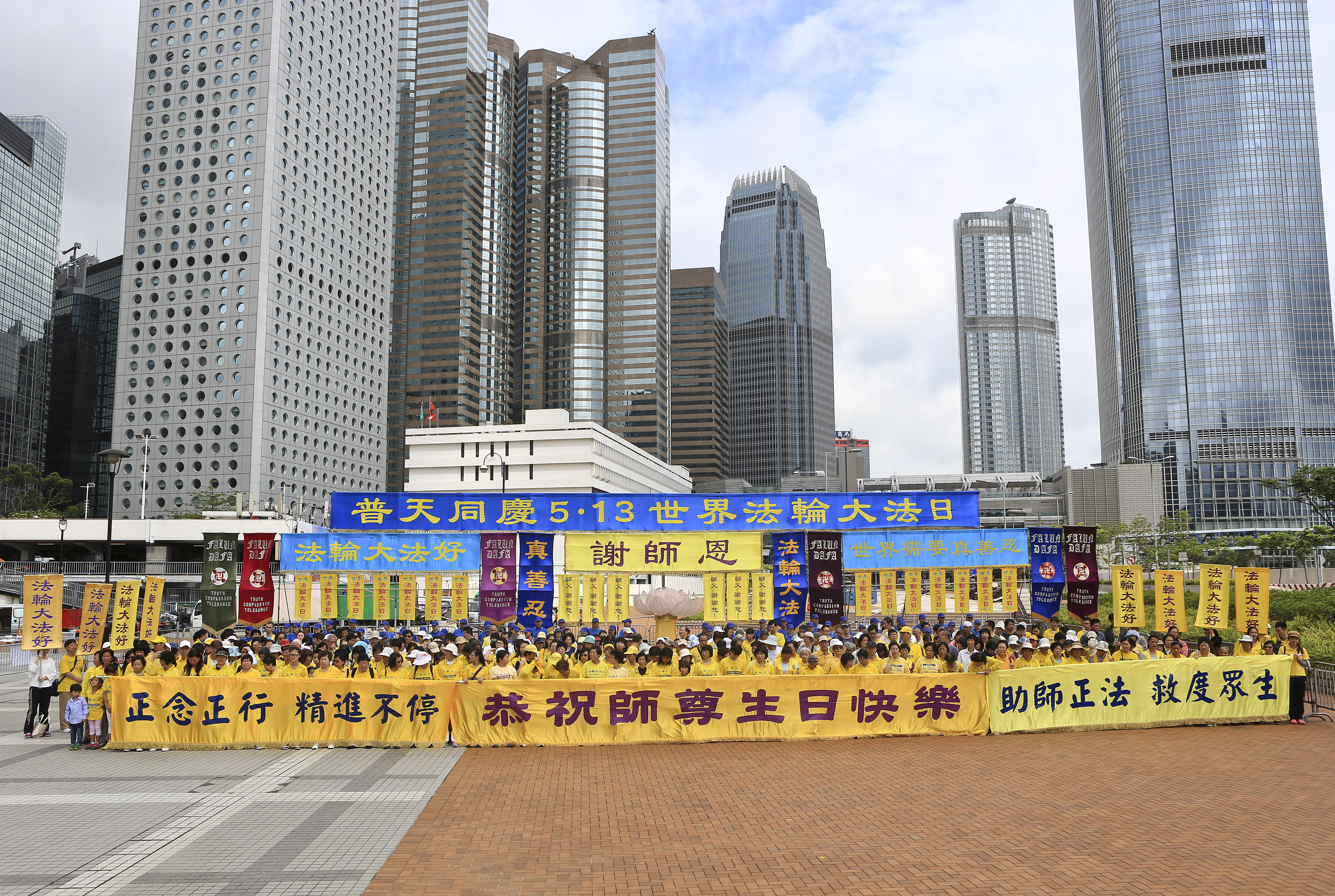 ![]() 图1. 法轮功学员五月十日在香港中环大会堂旁举行活动,庆祝法轮大法弘传世界二十二周年暨师尊六十三华诞。 |