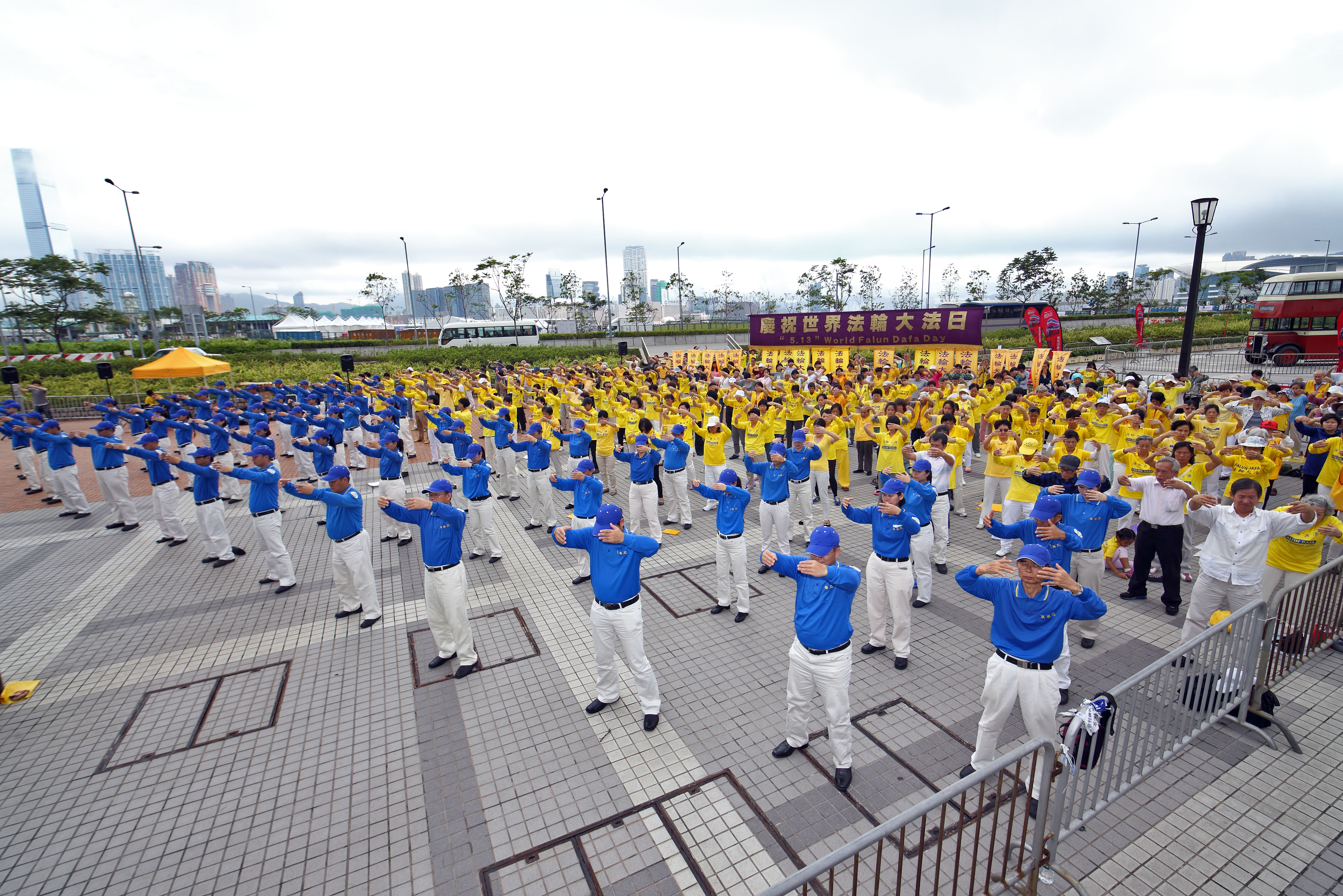 上午,数百名学员在中环香港大会堂前集体炼功,将大法的美好介绍给更多民众。接着腰鼓队表演歌舞的欢乐气氛之后,全体学员恭敬合十,齐颂:“恭祝师父生日快乐!”“师父,谢谢您!”“法轮大法好!”其后合唱《谢师恩》、《法轮大法好》等歌曲,表达他们对李洪志师尊的无限崇敬和感恩。