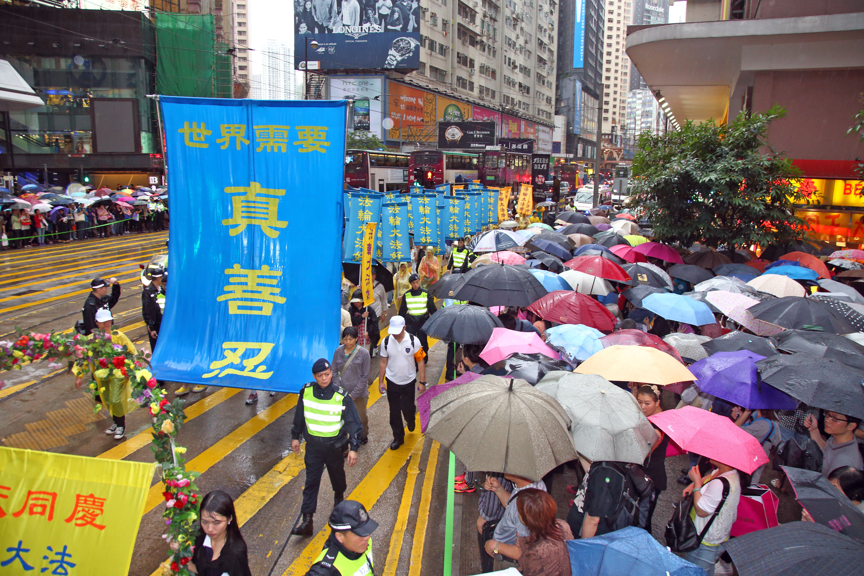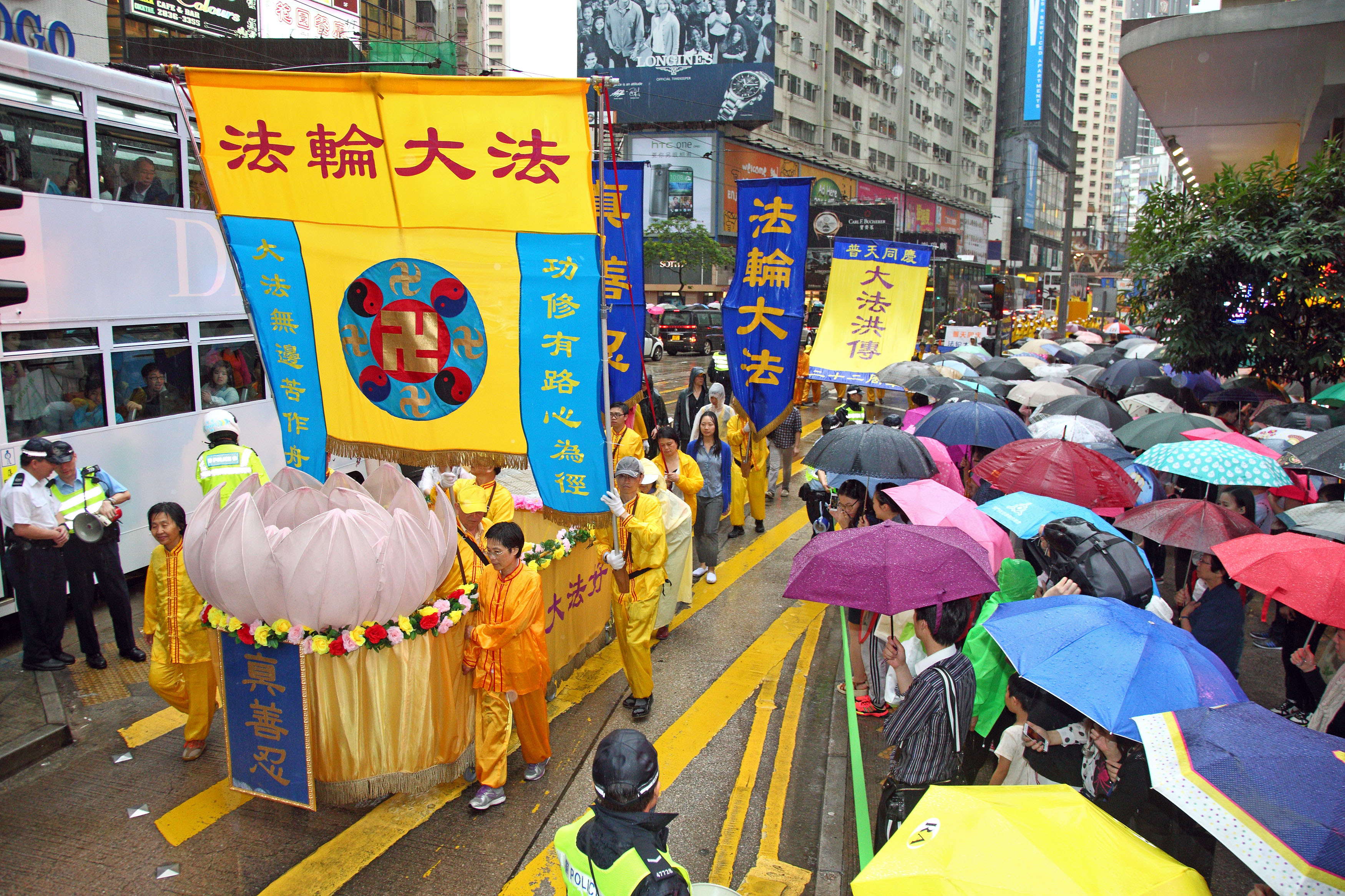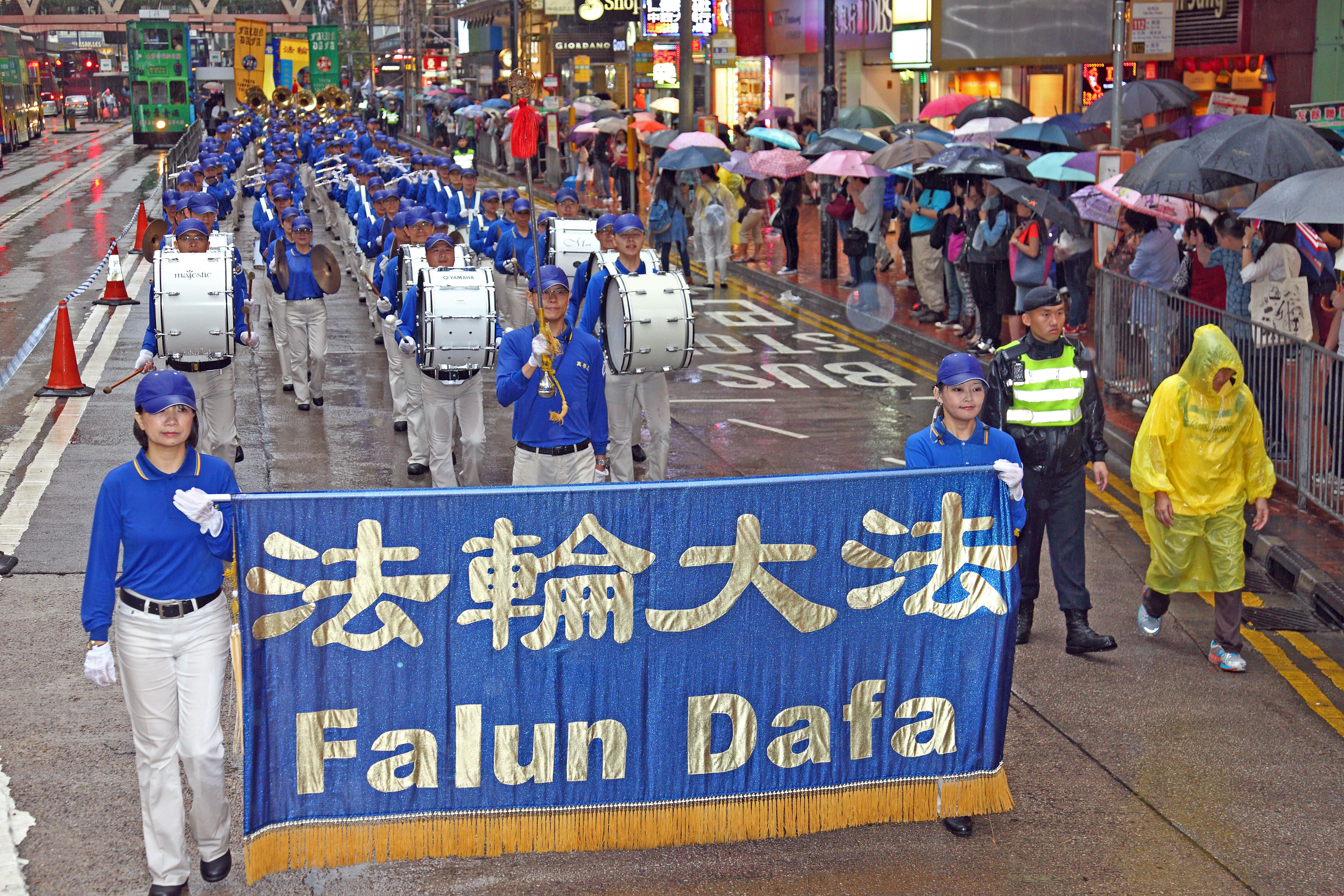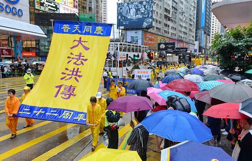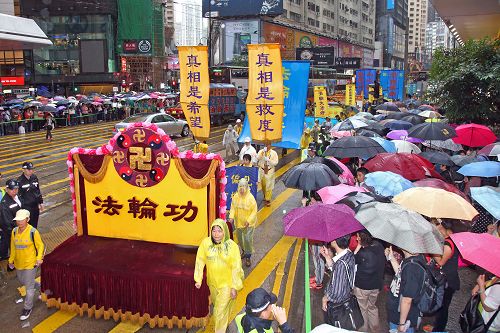 游行队伍在风雨中前进,狂风斜雨阻挡不了法轮大法美好的福音,以及人们想要了解真相的渴望。法轮功游行沿途吸引大批市民及游客冒雨观看,有的撑伞或头戴便帽站在人行道上频向游行队伍挥手致意,许多游客纷纷用手机、相机拍摄难得的游行画面,有的原本站在骑楼遮雨处,刻意挤到前排冒雨抢拍画面。法轮功的游行震撼着港民及中西游客。