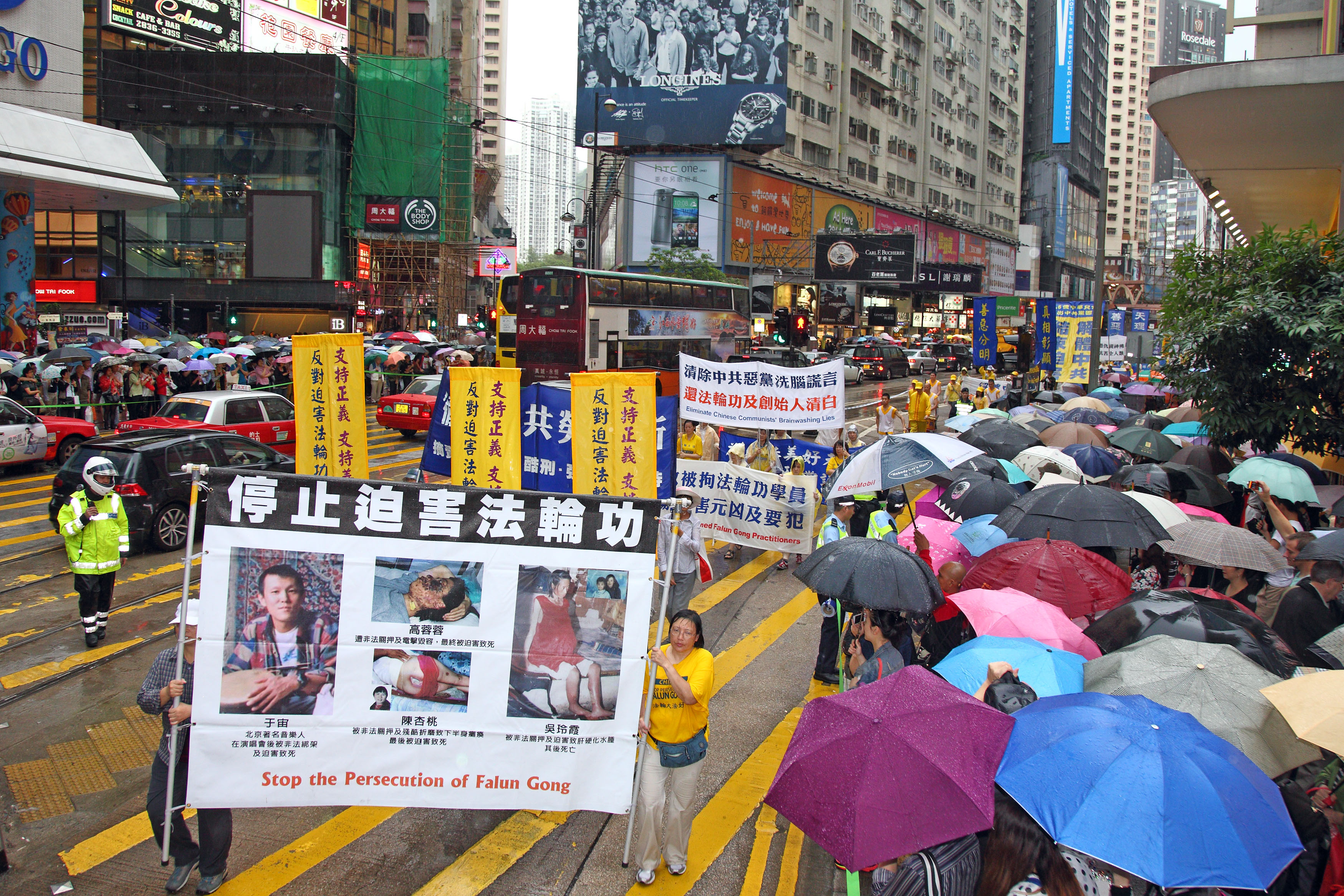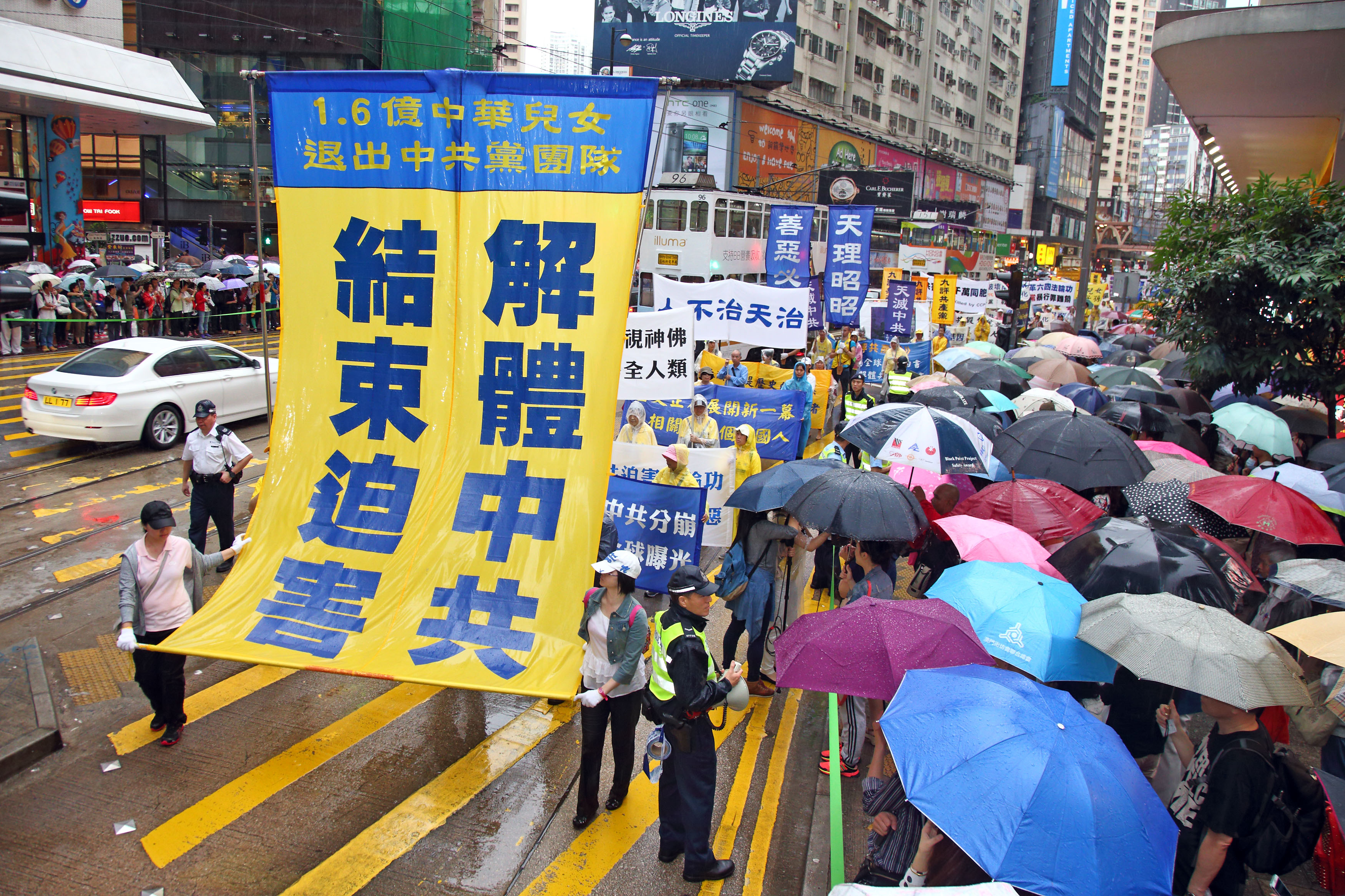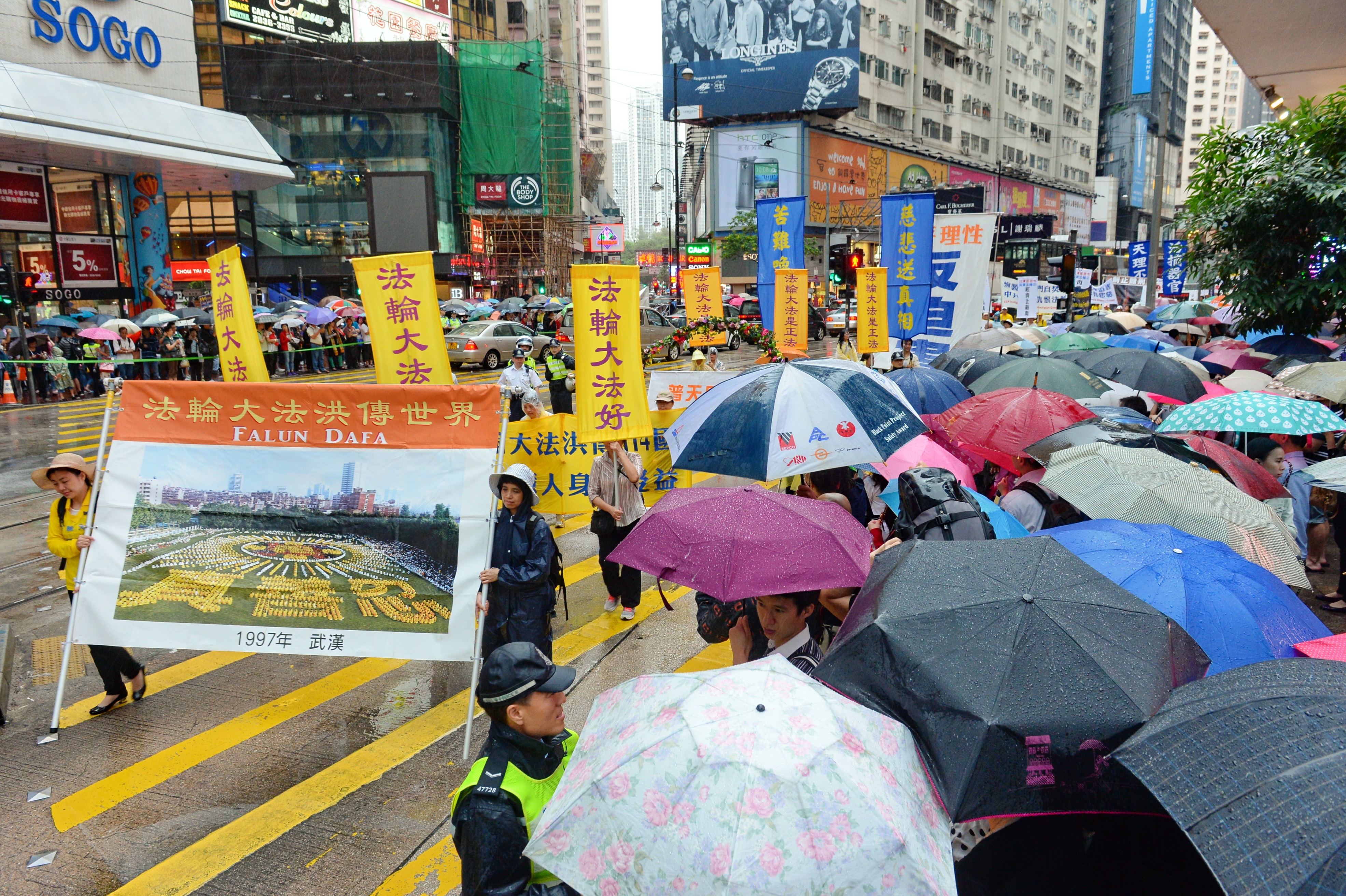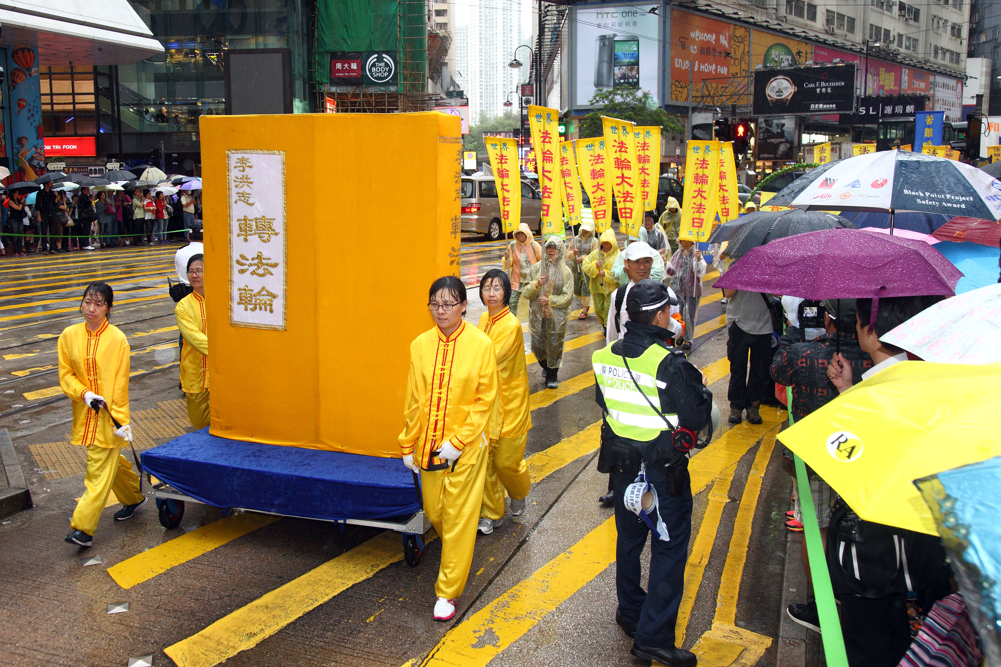 游行队伍在风雨中前进,狂风斜雨阻挡不了法轮大法美好的福音,以及人们想要了解真相的渴望。法轮功游行沿途吸引大批市民及游客冒雨观看,有的撑伞或头戴便帽站在人行道上频向游行队伍挥手致意,许多游客纷纷用手机、相机拍摄难得的游行画面,有的原本站在骑楼遮雨处,刻意挤到前排冒雨抢拍画面。法轮功的游行震撼着港民及中西游客。