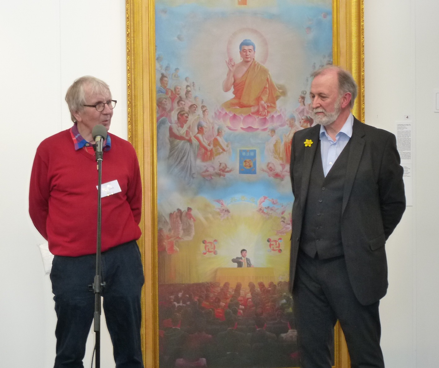 “真、善、忍”国际美展英国分部负责人Eddie Aitken向大家介绍道:在这次北欧艺术展上,“真、善、忍”国际美展艺术中心首次向公众推出了这套迄今为止最大规模的艺术展品。Eddie Aitken向观众们介绍了法轮大法修炼者通过对自己心性修炼,提高道德与修养,和对宇宙真理“真、善、忍”的信仰,以及在中国所遭受到中共独裁集团的无端残酷迫害,甚至被活摘器官的事实。他介绍道,雕像《佛像》的作者张昆仑教授本人就亲身经历了在劳教所里的非人迫害。