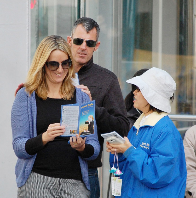 路过的一名西人少女接过了法轮功学员递给的传单,她先以英文表示感谢,紧接着出人意料地以中文对学员说:“我会讲中文。”她说:“法轮大法真好,我妈妈最喜欢法轮大法了,她还教我‘真善忍’好。”