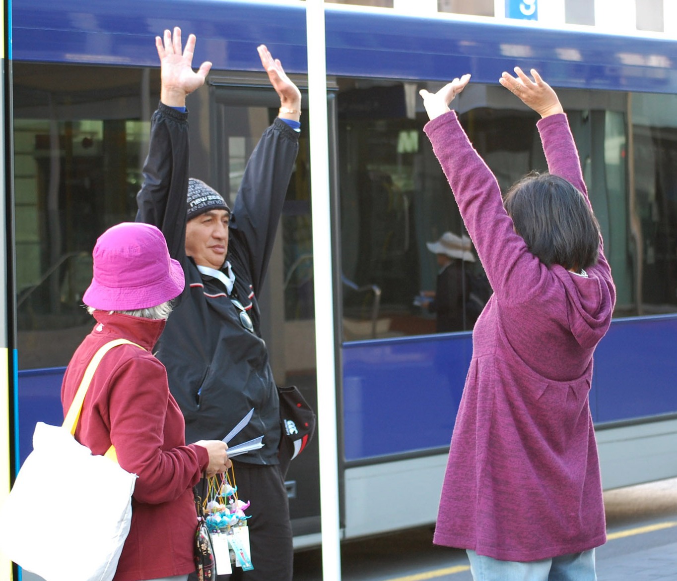 南半球的五月已近冬日,但新西兰庆祝法轮大法日活动现场一片温暖祥和,悠扬的法轮功炼功音乐声响起,感染了现场的每一个角落,音乐声中法轮功学员向路人演示了五套功法。众多路人被这优美的音乐与祥和的炼功场面所吸引,纷纷驻足观看,同时也认真阅读法轮功真相展板和传单,有人啧啧称赞道:“如此平和,太美了。”