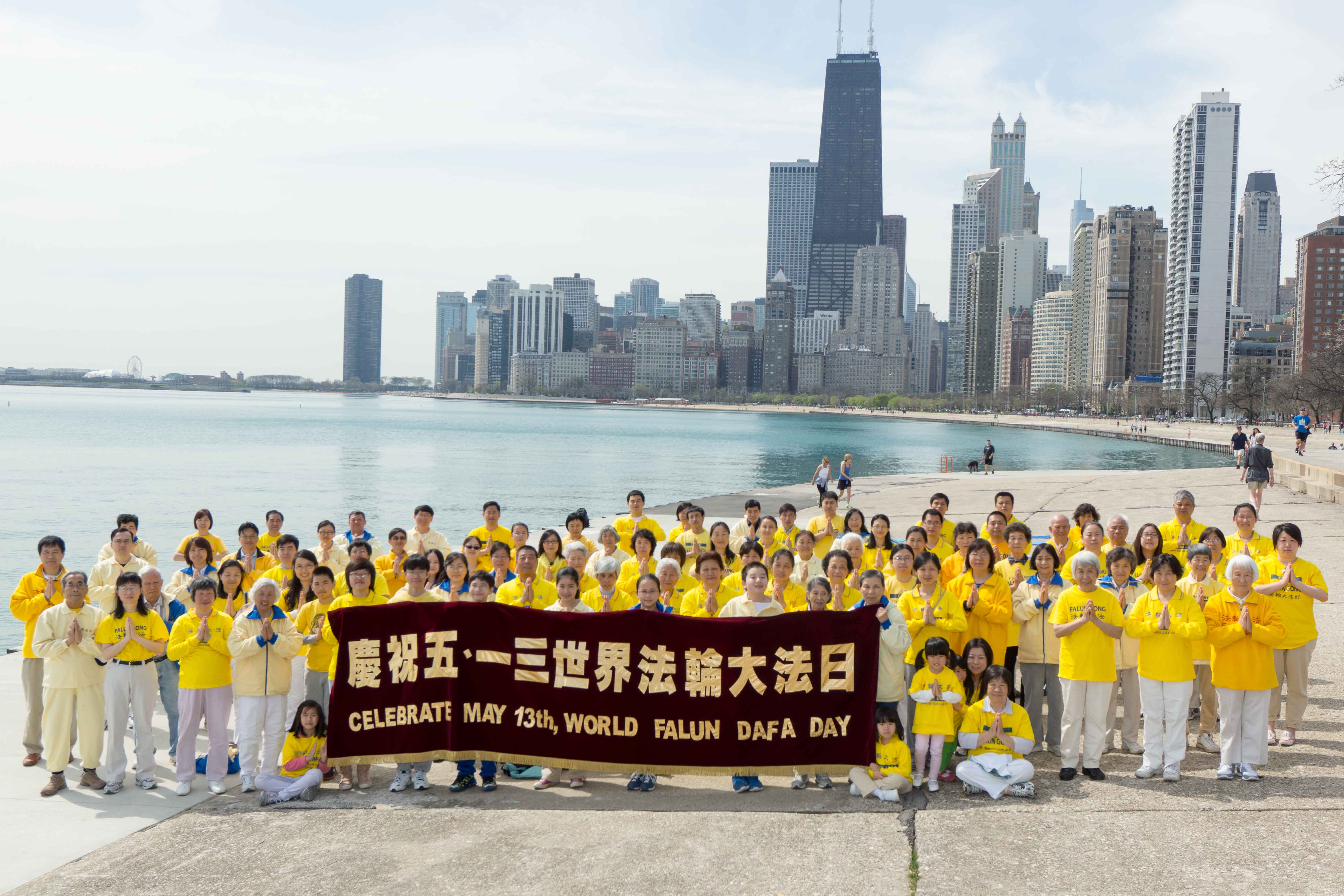 【明慧网二零一四年五月十三日】(明慧记者杨文玉芝加哥报道)二零一四年五月十日,美国芝加哥阳光灿烂,清晨,在美丽的密西根湖畔,“法轮大法好!”“师父生日快乐!”的声音响彻碧水蓝天间。来自大芝加哥地区及部分伊州的法轮功学员聚集在北大街湖滨公园,集体炼功,庆祝法轮大法弘传二十二年和第十五届世界法轮大法日。他们中有连续十五年参与大法日活动的老学员,也有来美不久,首次参加大法日庆祝活动的大陆学员,还有从小随父母、祖父母一起修炼,如今逐渐成熟的新一代大法小弟子,他们均表示,大法让他们知道生命的真正意义,在这个普天同庆的日子里,他们最想对师尊说的一句话就是:做好师父要求的三件事,唯有精進,才能报答师父的慈悲苦度。