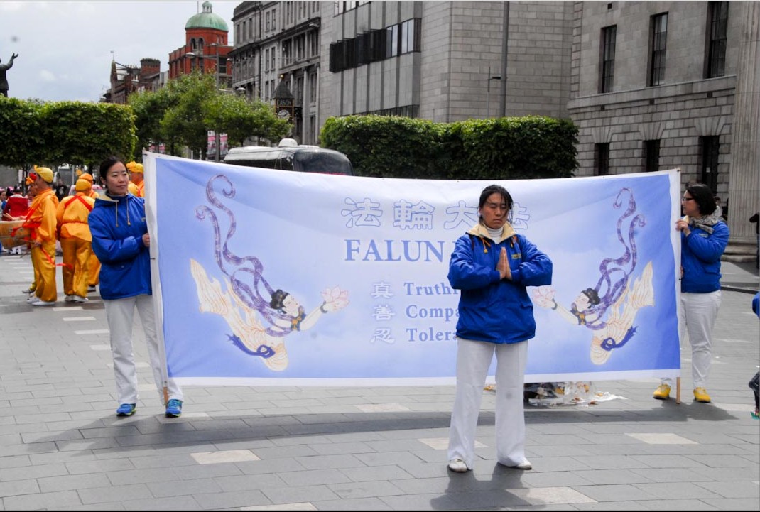 当天中午,以大型莲花花车为前导的游行队伍从都柏林市中心的纪念公园(Garden of Remembrance)开始,沿途经过华人商铺林立的帕奈尔大街(Parnell Street),最终到达GPO。法轮功学员们在大花车上演示法轮功的五套功法,紧随花车的是横幅方阵。沿途的行人纷纷驻足观看、拍照,其中不乏华人。