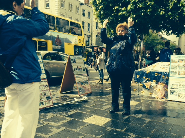 游行结束后,法轮功学员在GPO门前举行了庆祝活动。尽管当天天气不时风雨相伴,但是宁静祥和的功法演示和精彩的表演吸引了大量路人驻足观看。法轮功学员展示出的平和与展板上中共的迫害酷刑形成鲜明对比,人们冒着风雨在反迫害签名表上签字。来自斯洛伐克的乌里亚娜(Ulliana)女士就是其中的一位。乌里亚娜女士和朋友一道来都柏林参加国际会议,欣逢爱尔兰学员庆祝世界法轮大法日的活动。身体不便的她还当场模仿起炼功动作来。乌里亚娜女士表示在家乡就听闻过法轮功反迫害真相,虽然她自己并没有修炼法轮功,但是希望能通过这种方式来表达对法轮功的支持和敬意。