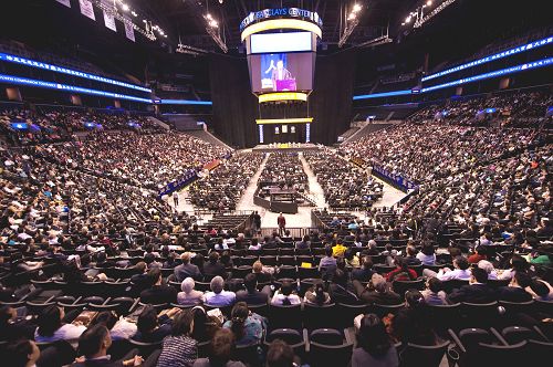 【明慧网二零一四年五月十四日】(明慧记者采菊、善果纽约报道)昨日(星期二)是五月十三日,即世界法轮大法日暨李洪志师父华诞。来自五十多个国家二百多个地区的七千多名大法弟子,在纽约市布碌伦区的巴克里中心(Barclays Center)参加了二零一四年纽约法轮大法修炼心得交流会。李洪志师父亲临会场,为大法弟子讲法一小时四十分钟。