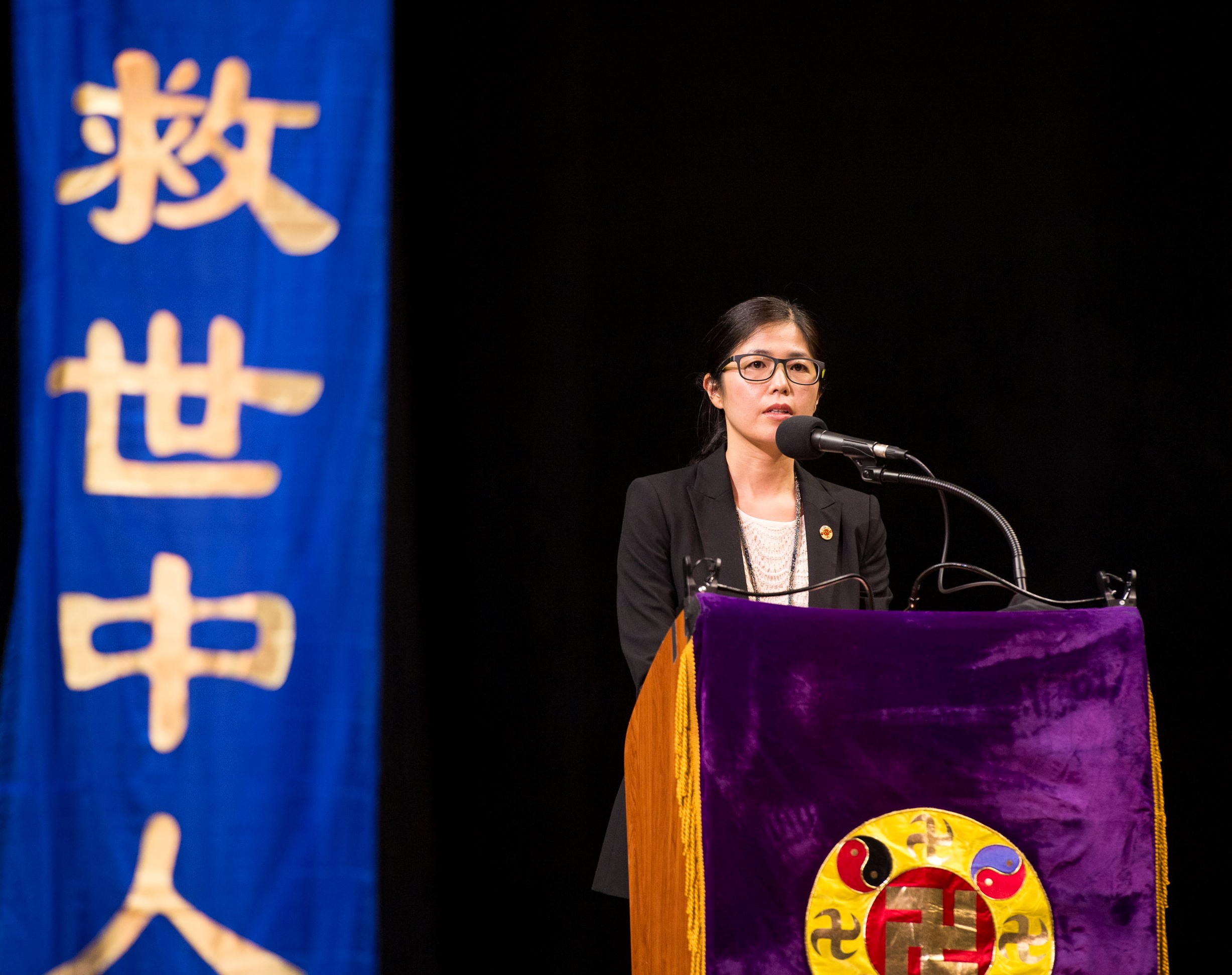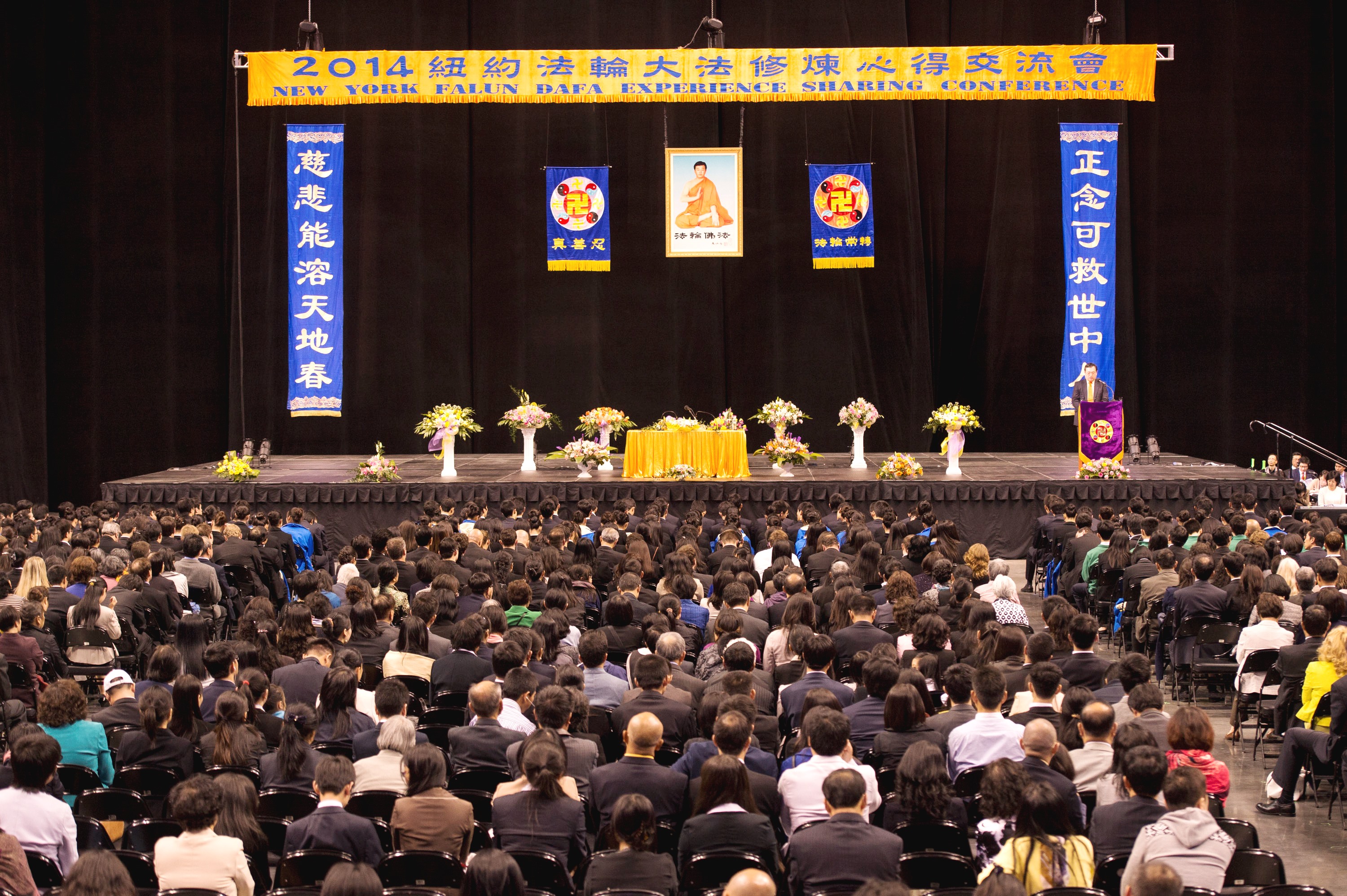 法会会场的主席台上鲜花芬芳。正上方是中英文“2014纽约法轮大法修炼心得交流会”大横幅,“慈悲能溶天地春 正念可救世中人”[1]的蓝底金字大条幅悬挂两侧。全方位电子大屏幕,坐在会场的任何一个角落都能看的很清楚。绕场一周的电子屏幕上是李洪志大师《洪吟》里的诗句,敦促大家比学比修,精進,再精進。