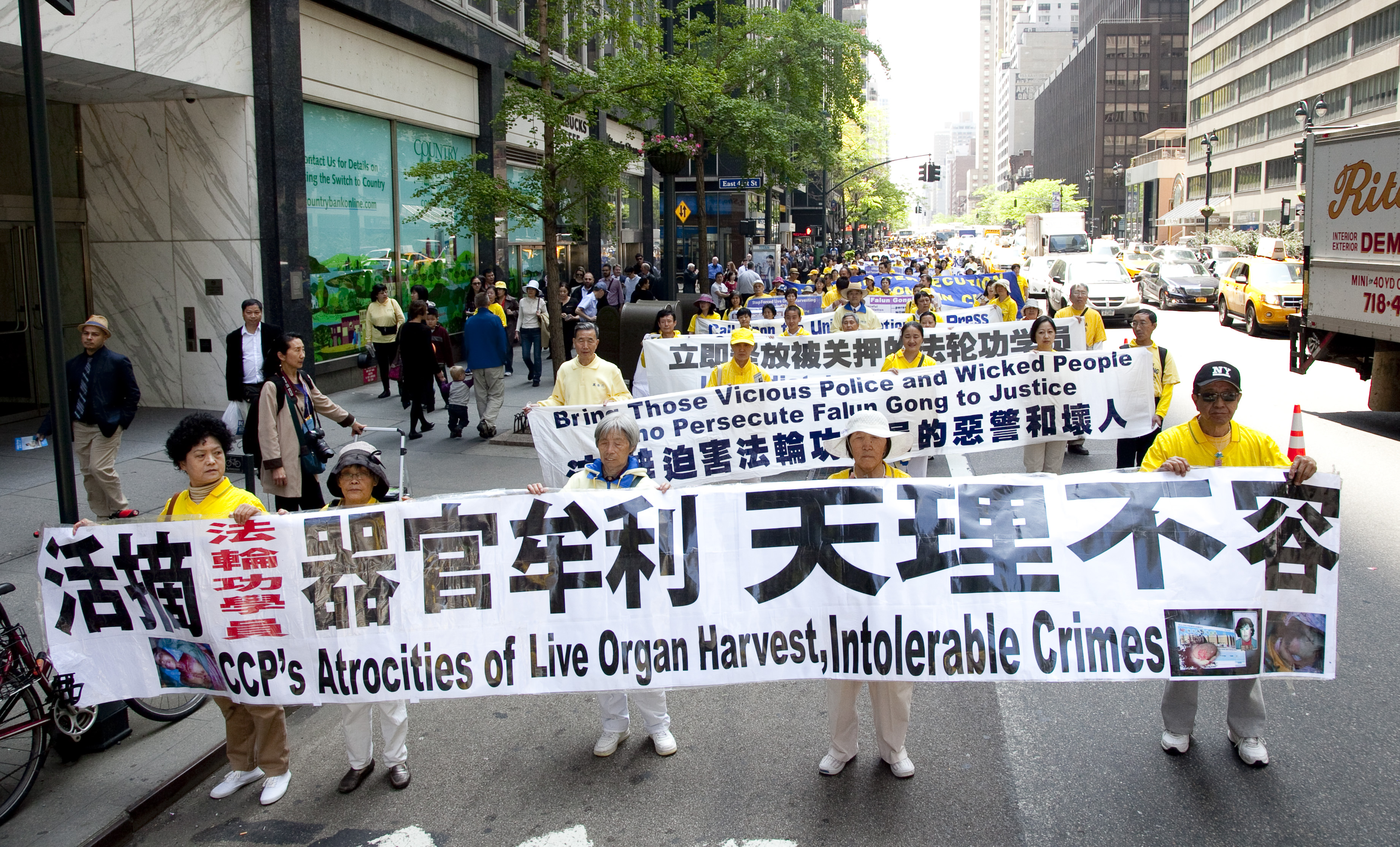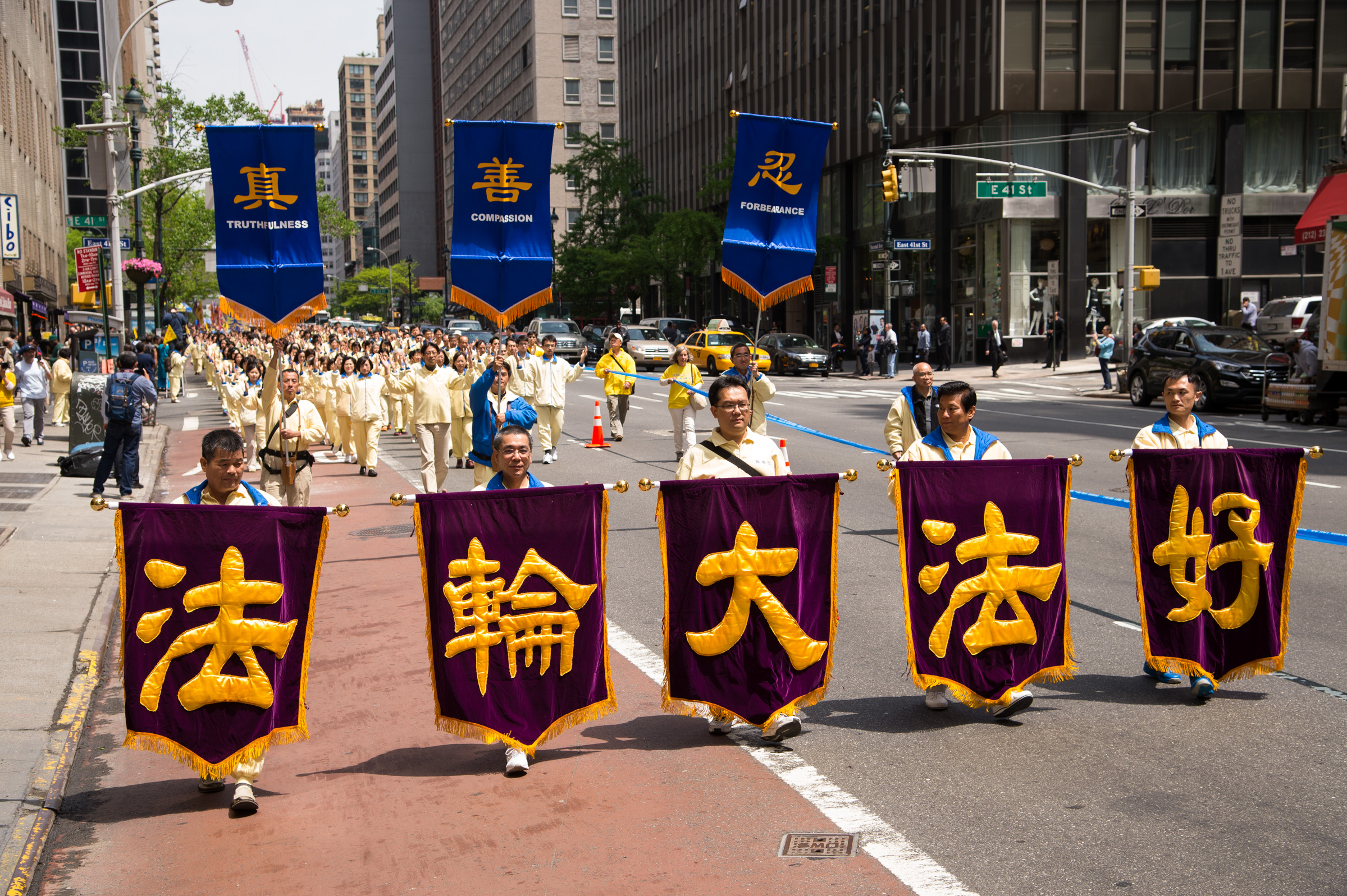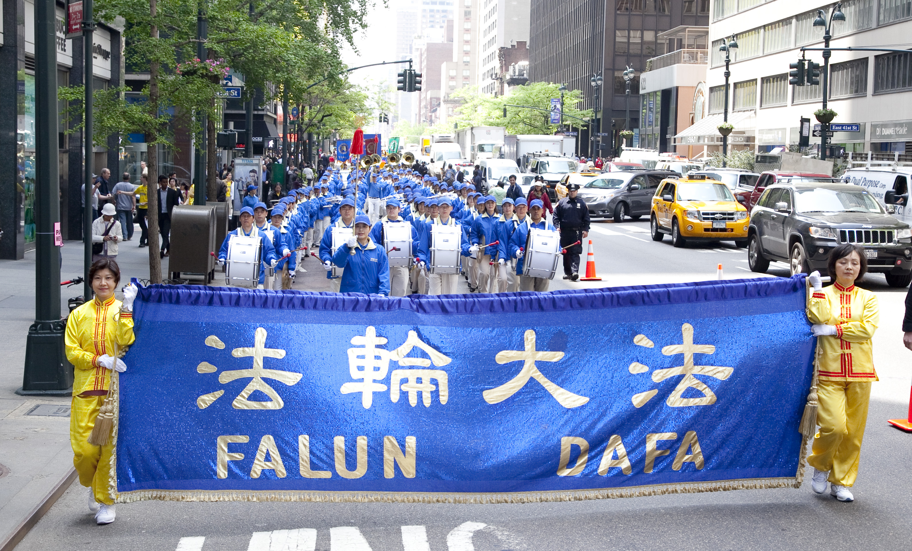 当天是星期三,正值工作日,游行于中午12点半开始,队伍由天国乐团开路,接下来是法轮功功法演示的队伍,以及展示大法弘传世界、中共活摘法轮功学员器官和酷刑迫害等横幅的队伍……色彩绚丽而浩荡的队伍吸引了众多在联合国大楼及附近高级办公楼工作的人士驻足观看,并了解法轮功。并有观众现场学起了功法。