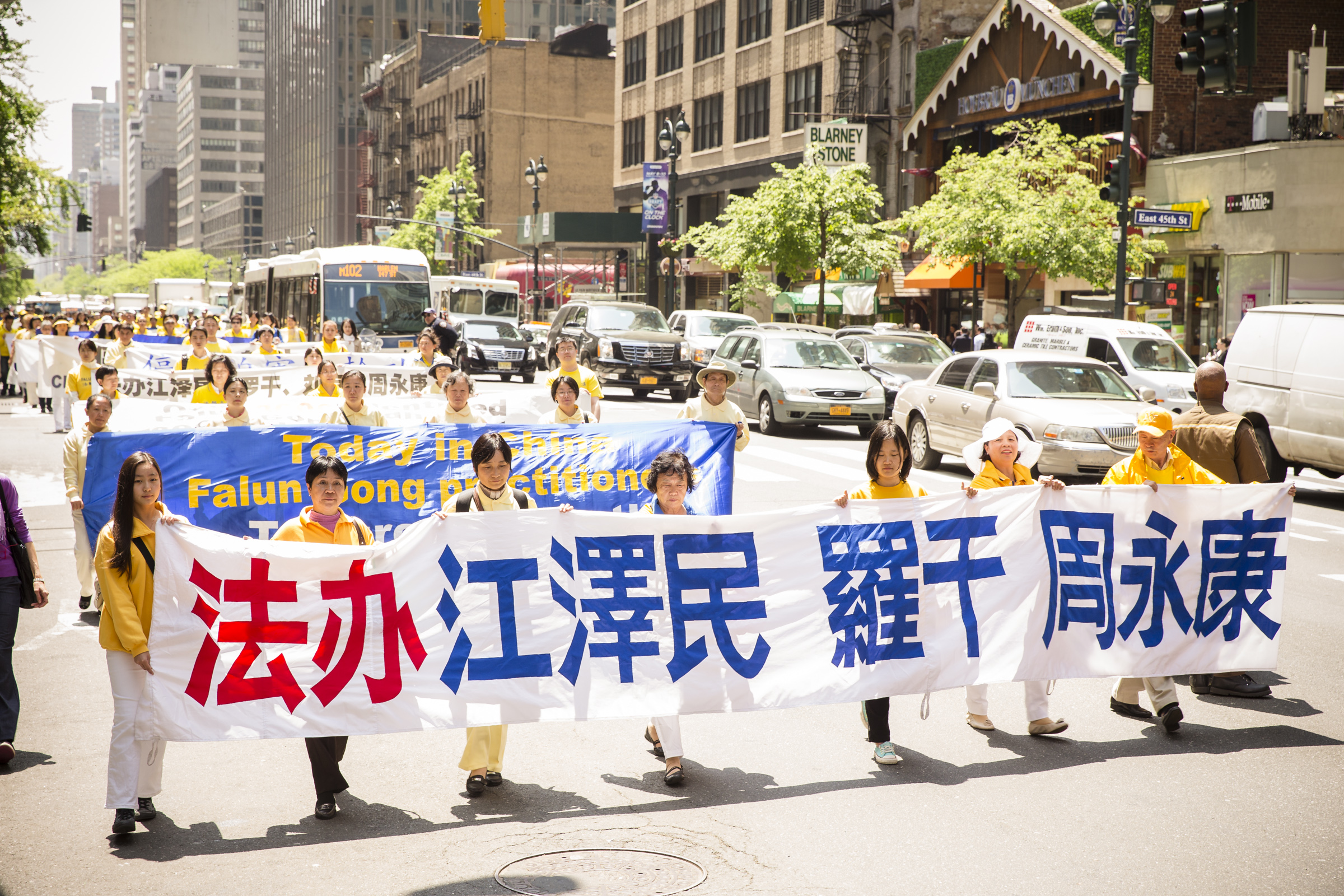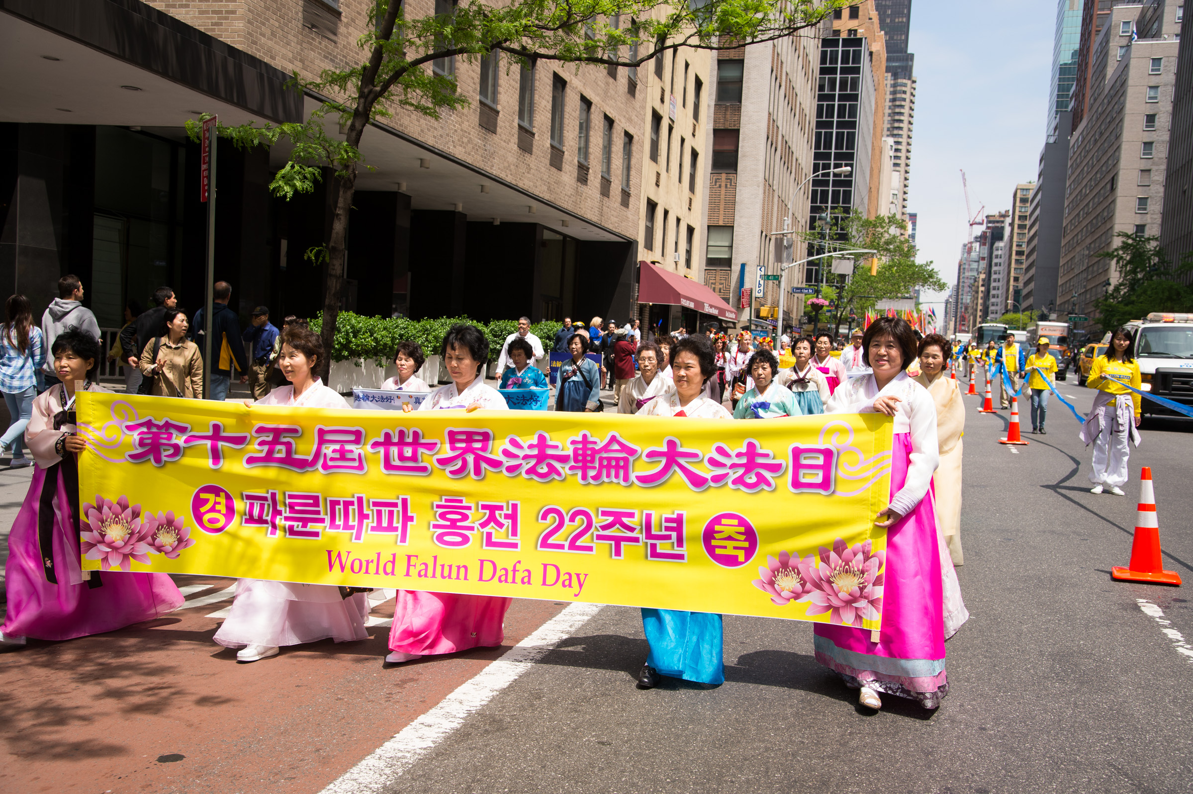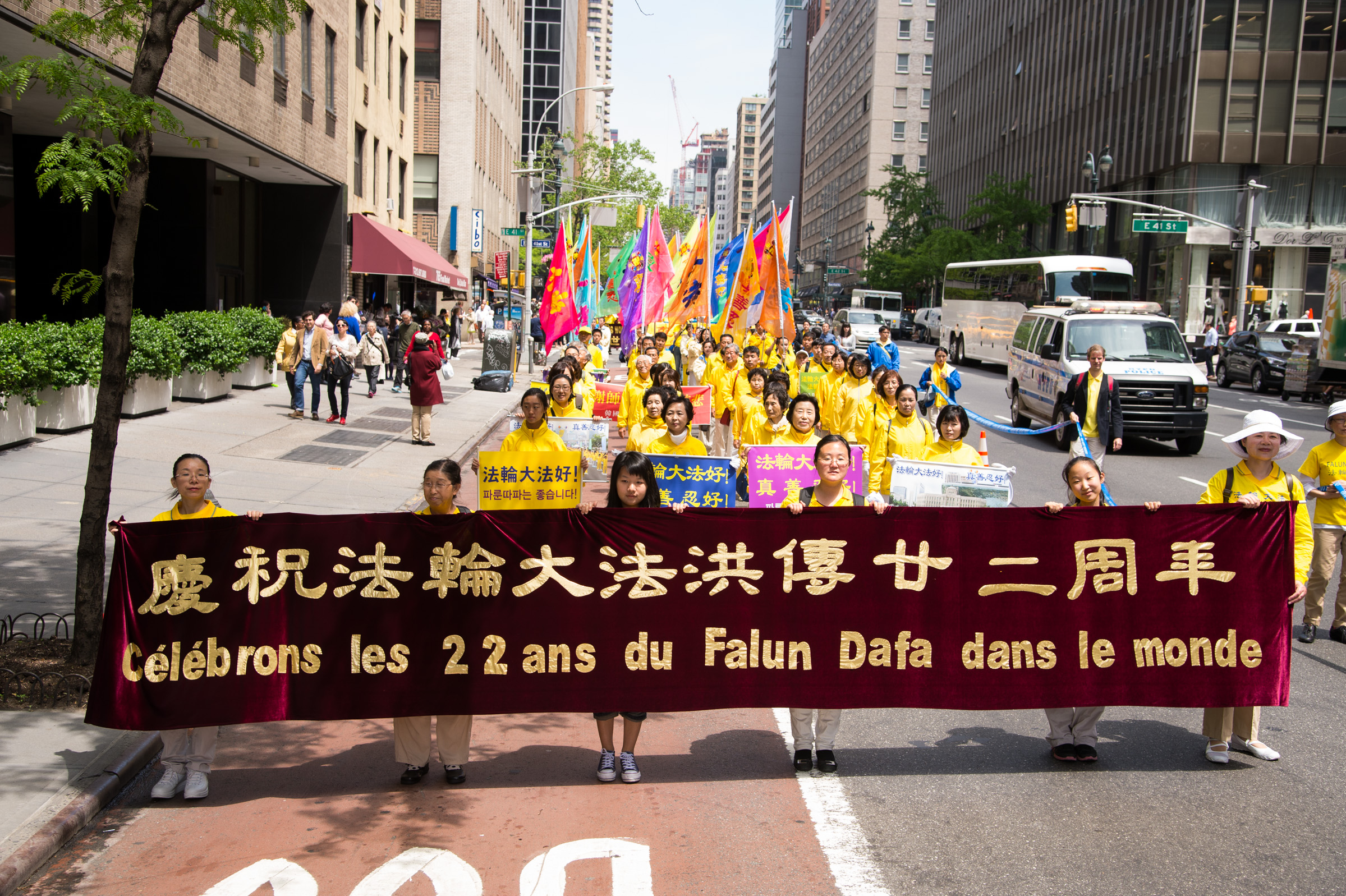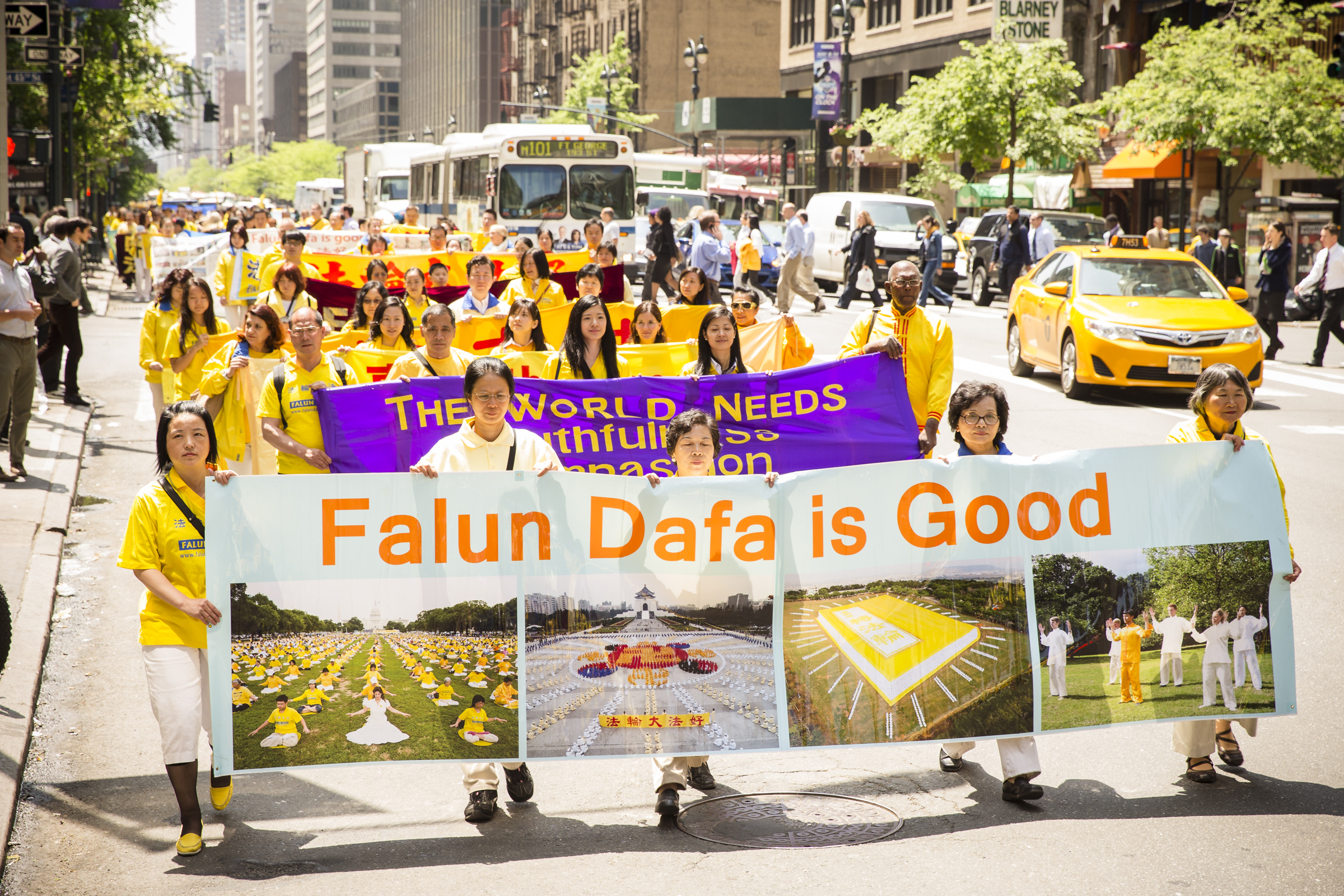 当天是星期三,正值工作日,游行于中午12点半开始,队伍由天国乐团开路,接下来是法轮功功法演示的队伍,以及展示大法弘传世界、中共活摘法轮功学员器官和酷刑迫害等横幅的队伍……色彩绚丽而浩荡的队伍吸引了众多在联合国大楼及附近高级办公楼工作的人士驻足观看,并了解法轮功。并有观众现场学起了功法。