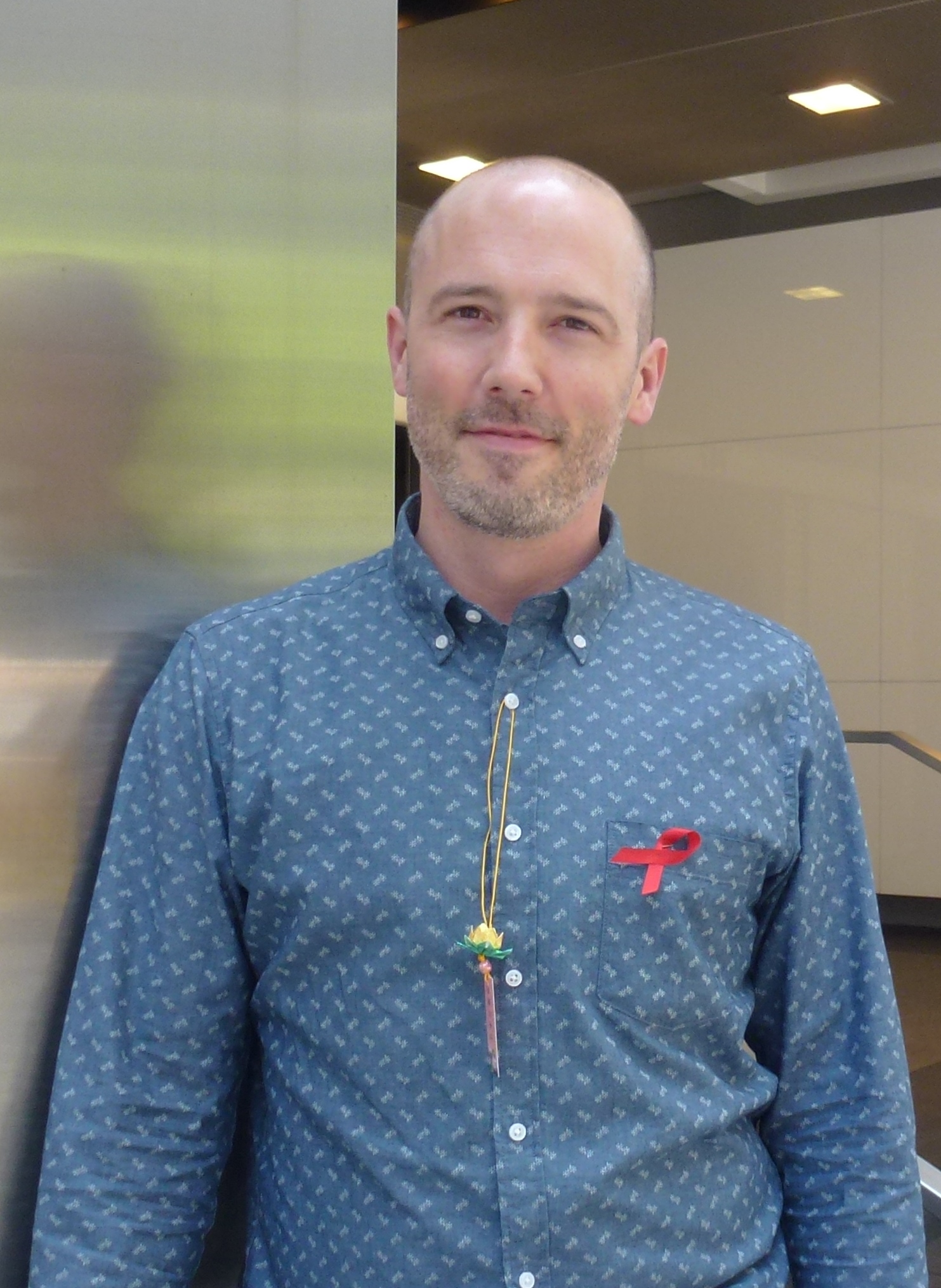 ![]() 图19:法律书籍的出版商克瑞格(Graig)了解真相后,高兴地将法轮功学员送上的带有介绍法轮功真相的小莲花挂在自己的胸前。 |