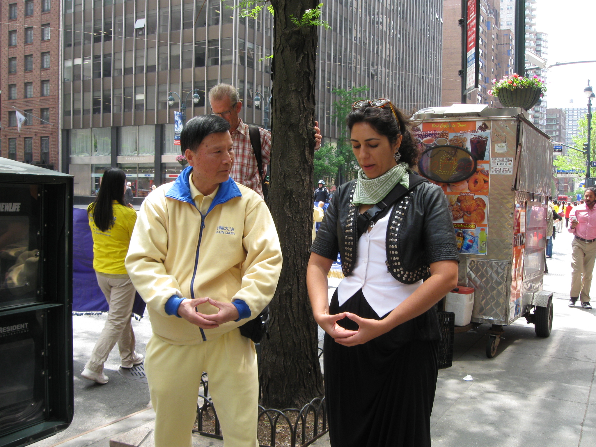 李丽昂(Lilian)和何塞(Jose) 在曼哈顿的一家律师事务所工作。他们站在路边观看游行好一会儿了,他们觉得游行很漂亮,也很和平。他们注意到了在游行队伍中也有很多西方人,可见法轮功有很多的支持者。何塞还说:“我喜欢真、善、忍,我们应该珍视这些价值。让人们关注法轮功的问题很重要,祝你们好运!”