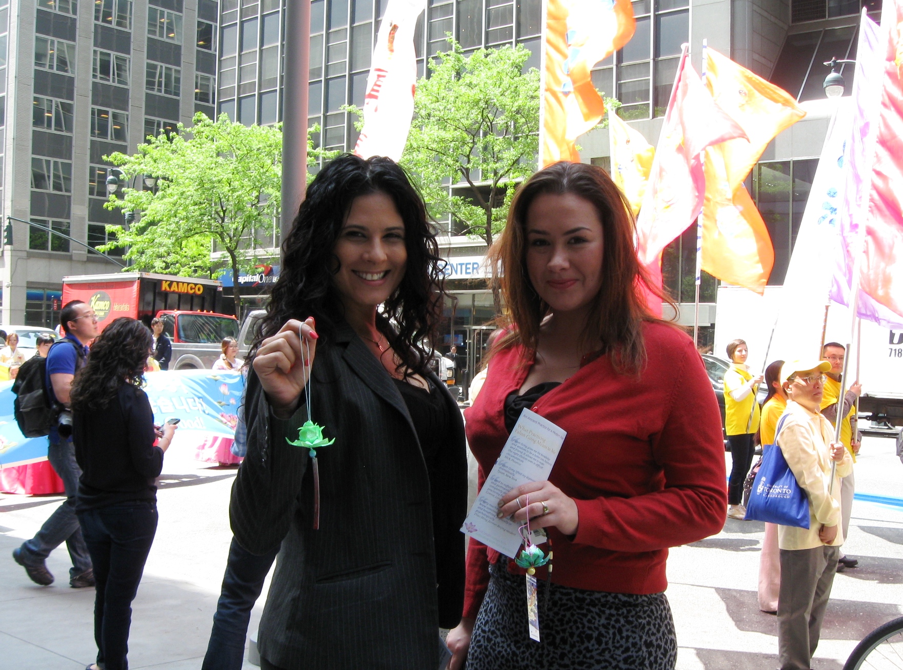![]() 图23:Sara Obyle(右)和同事被壮观的游行队伍吸引观看,并表示要进一步了解法轮功。 |