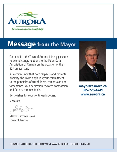 奥罗拉市(Aurora)市长捷夫瑞•道威(Geoffrey Dawe)在贺信中写道:“我谨代表奥罗拉市,很高兴在此向加拿大法轮大法学会举办的(法轮大法传世)二十二周年庆祝活动致以热烈祝贺。 ”